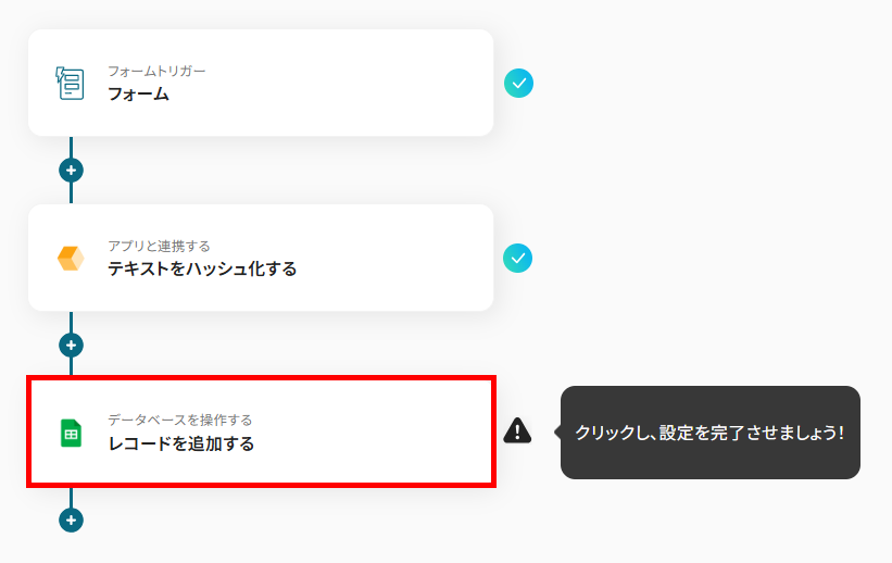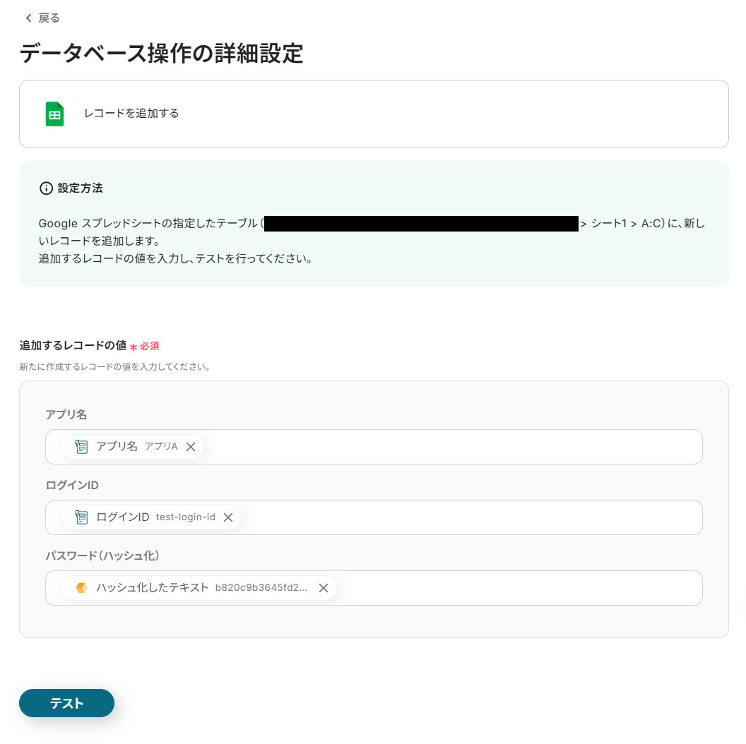 最後に、Google スプレッドシートにフォームの回答やハッシュ化した情報を追加する設定を行います。