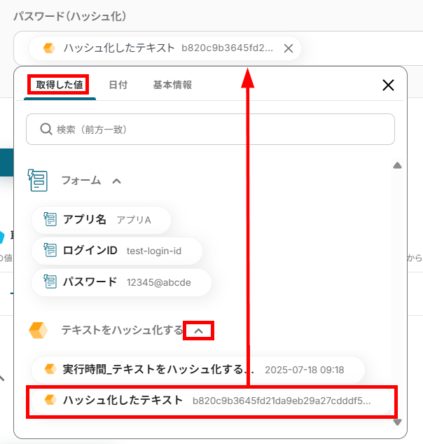 フォームの回答や0CodeKitでハッシュ化した値を設定する場合は、取得した値を利用します。
