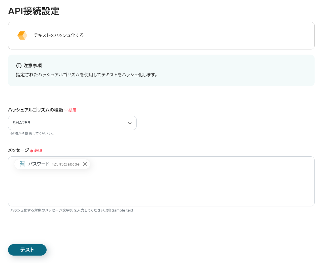 ハッシュアルゴリズムの種類とメッセージの設定が済んだら、テストをクリックしましょう。