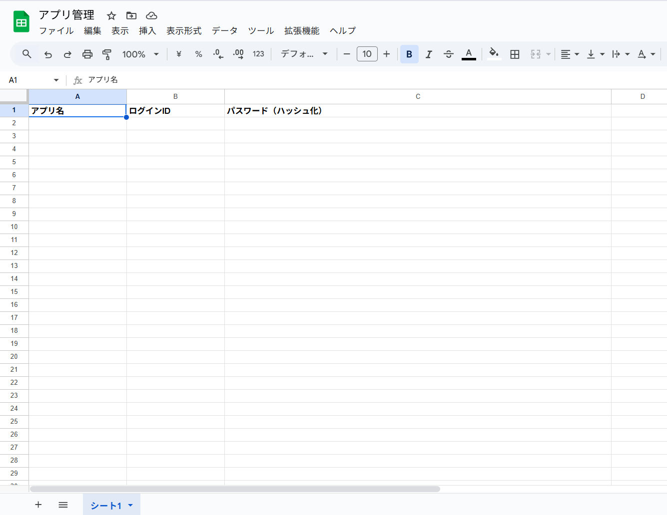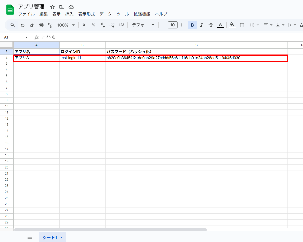 今回は、アプリのログインIDとパスワードを管理する際に、パスワードをハッシュ化することを想定して、以下の項目を設置しています。