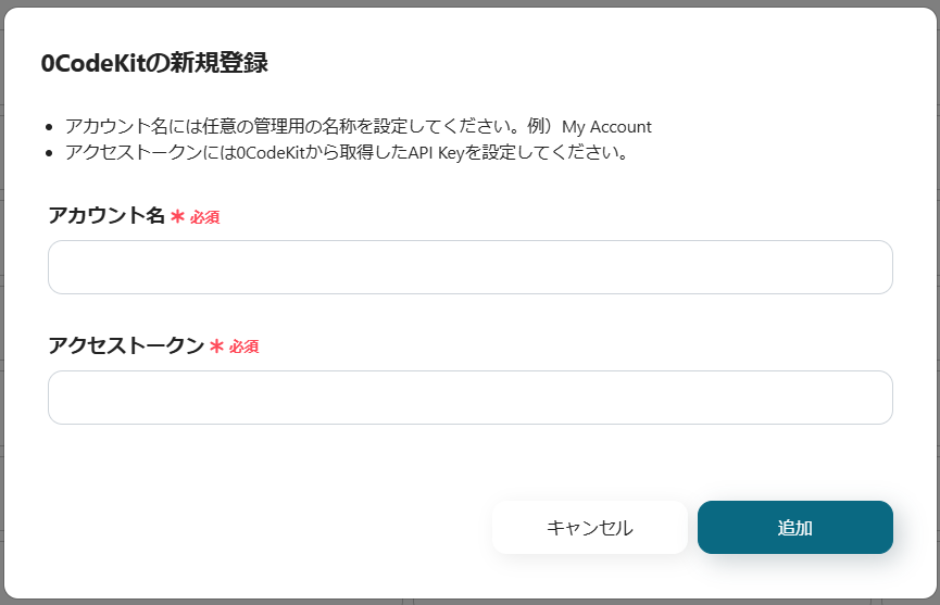 - アクセストークンには、0CodeKitのDashboardに表示されているAPI Keyを入力してください。