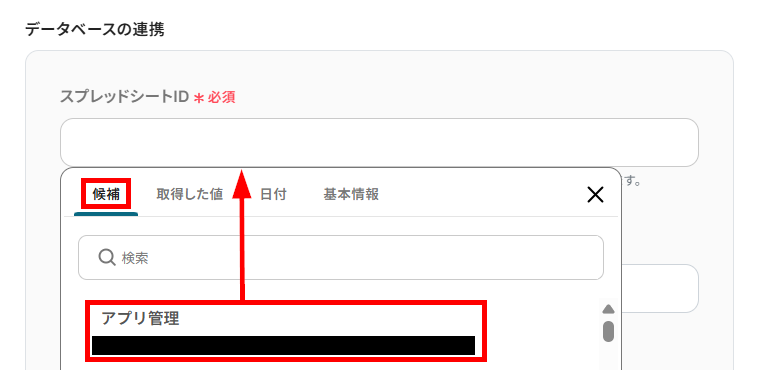 スプレッドシートIDとスプレッドシートのタブ名は、候補から設定できます。