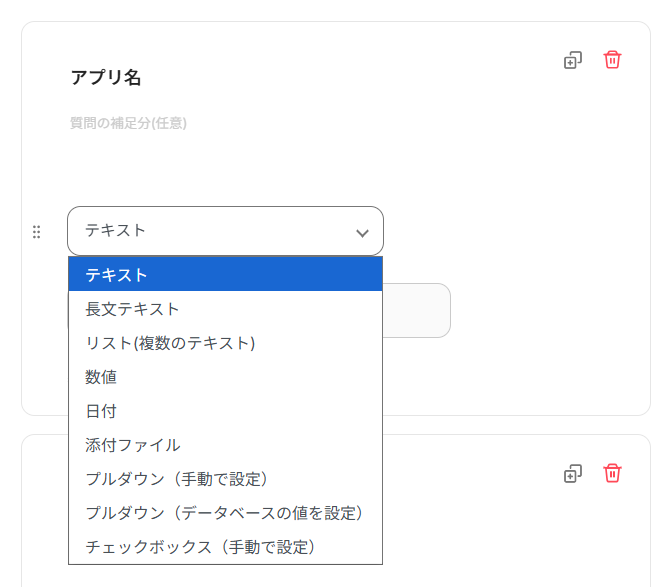 フォームの各項目の形式は、テキスト以外にも設定することができます。