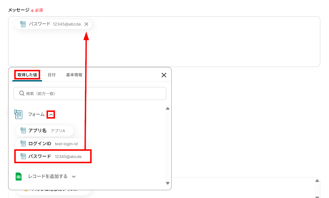 - 取得した値を設定することで、フォームの回答ごとに変わるパスワードを動的にメッセージへ反映できます。