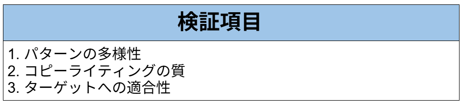 出力された3つのパターンは、それぞれ異なるアプローチを取っており、ターゲットに対して多角的な訴求を行っています。
