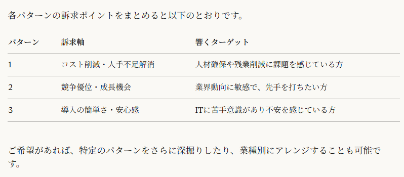 かなり満足のいく結果が得られました。3つのパターンがしっかりと異なる訴求軸に基づいて生成されており、それぞれがターゲットに合わせたメッセージを伝える内容になっていると思いました。特に、パターン1では「コスト削減」や「人手不足解消」といった、経営者が直面する具体的な課題を的確に捉えており、読者の共感を得やすい印象です。パターン2は競争優位性を訴求し、業界の動向に敏感なターゲットに対して非常に有効に働くと感じました。また、パターン3ではAI導入の簡便さを強調し、ITに詳しくない人でも安心して始められる点を伝えています。