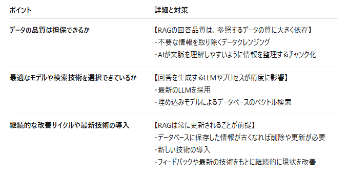 RAGの改善策を選ぶ際は、以下の順で各ポイントをクリアできているかを確認してみてください。