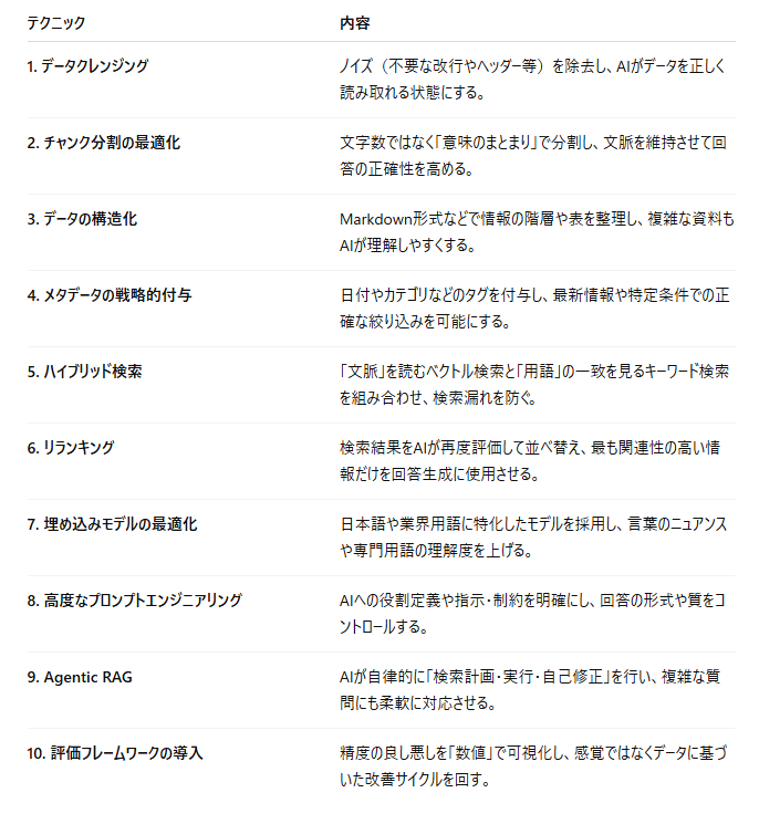 この記事では、【データ品質】【利用するLLMや検索技術】【継続的改善や新技術の導入】の観点から、具体的な10の改善テクニックを紹介しました。