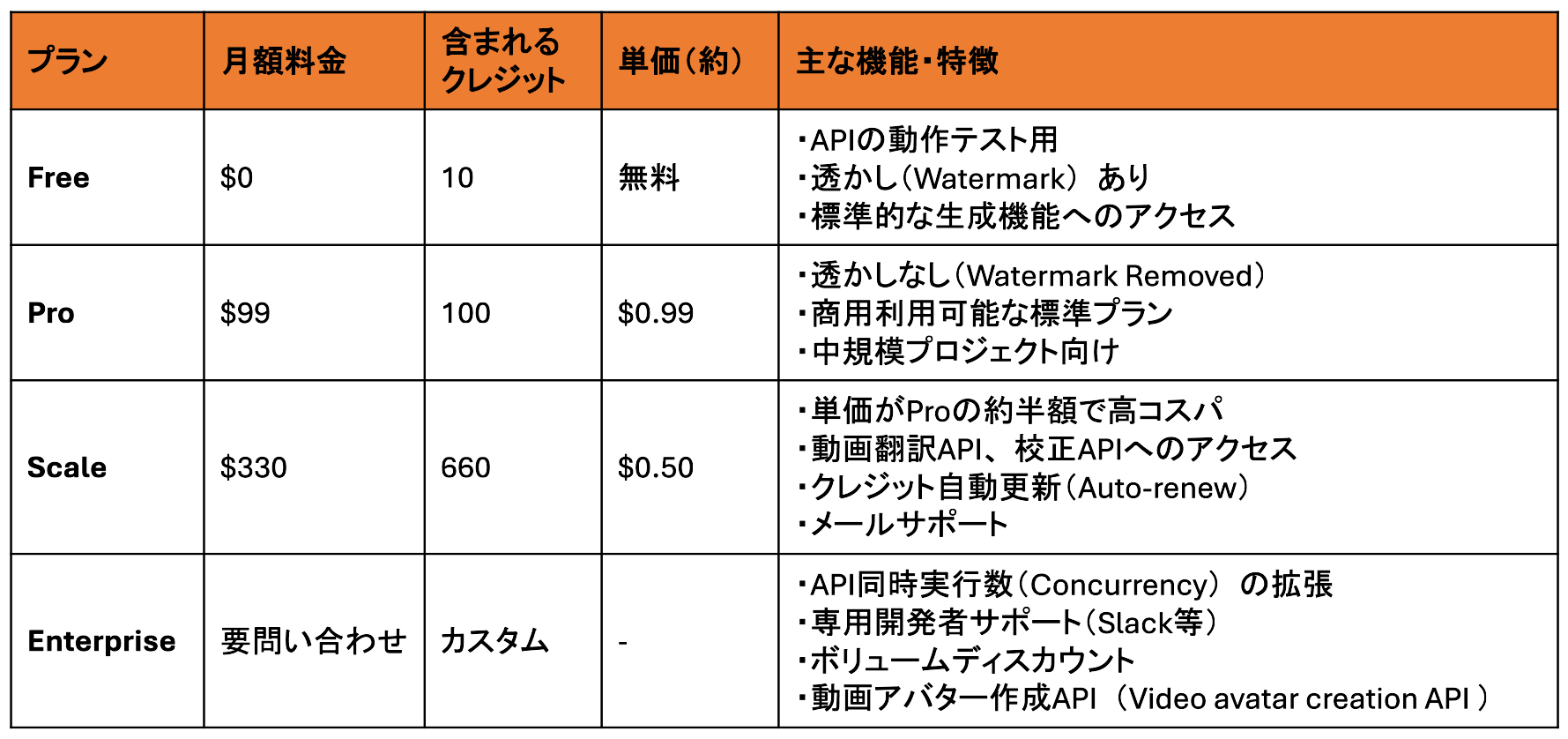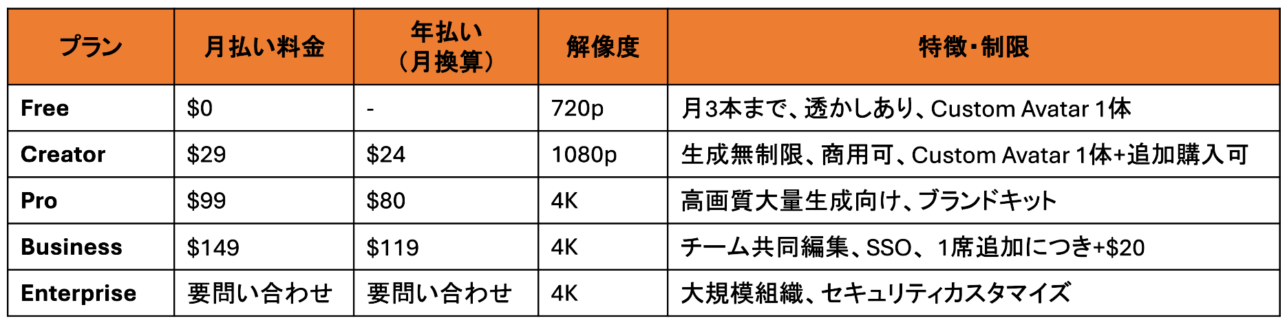 HeyGenには、無料でお試しができるプランから、個人クリエイター向け、そして企業向けのビジネスプランまで幅広く用意されています。