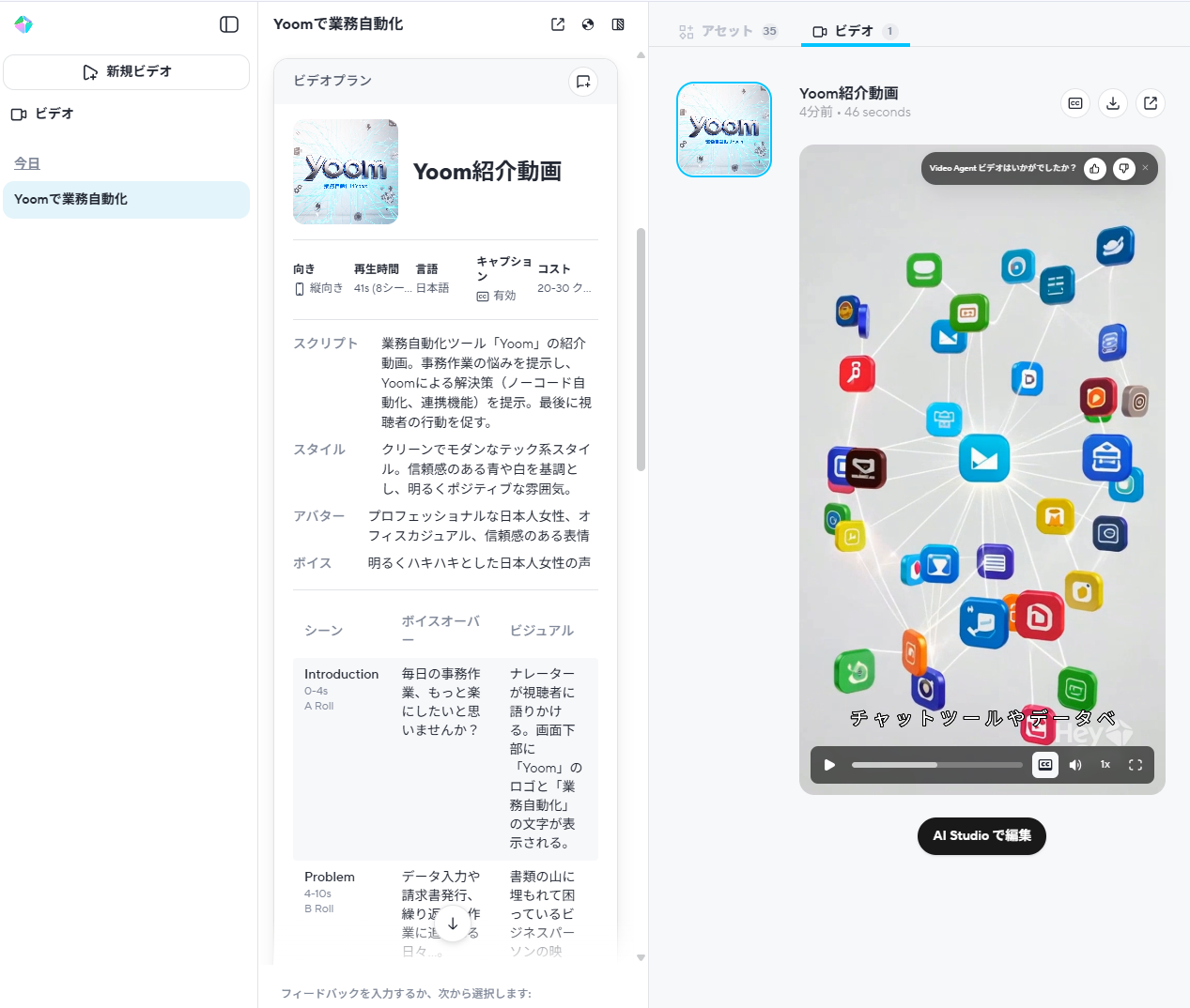 今回は「サービス紹介の動画」という設定で、Yoomの紹介動画を作成しました。