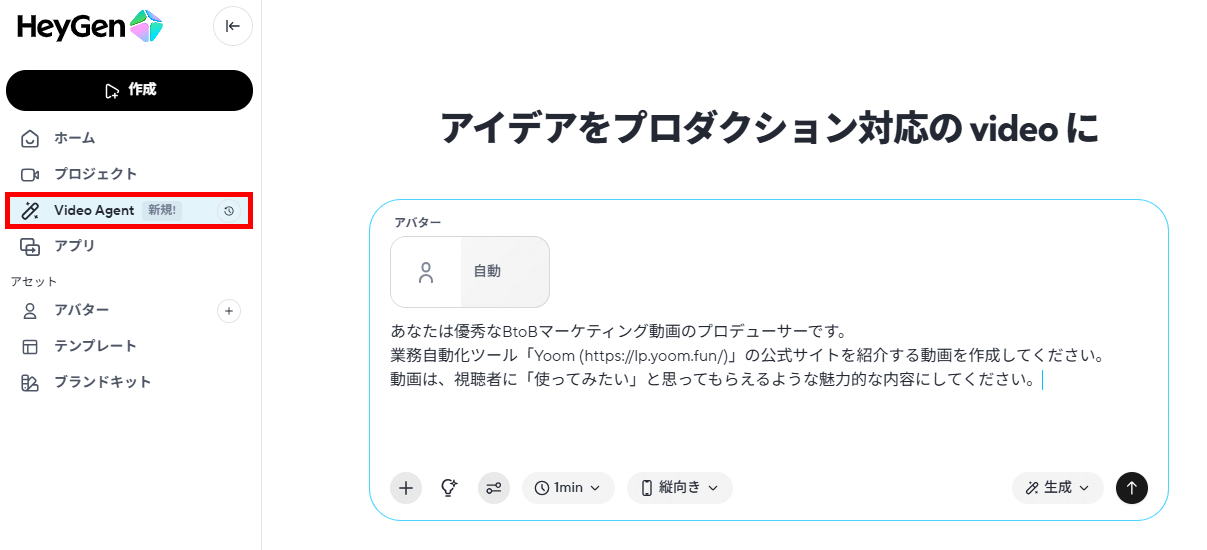具体的には、HeyGenの「Video Agent」を使い、「1分」「縦向き」の設定で、以下のプロンプトを送信しました。