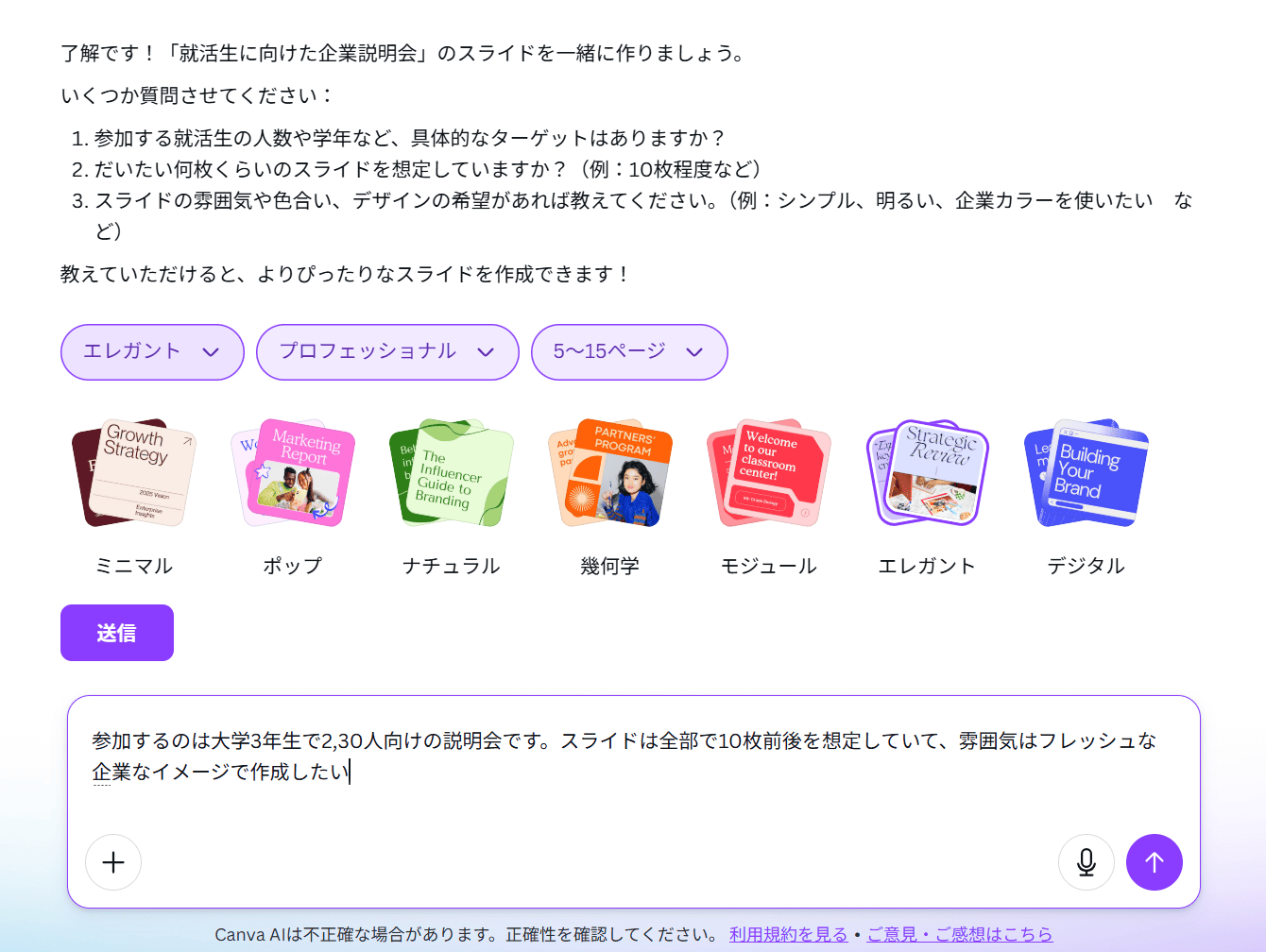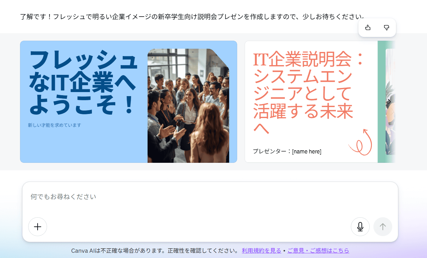 先に試用したイルシル (Irusiru) と比較すると、Canva AIはより詳細な質問をしてくる印象を受けました。具体的には、社員数やターゲット層、スライドのイメージ(アットホーム、スタイリッシュなど)、業界や企業の種類といった、より具体的な情報が求められました。