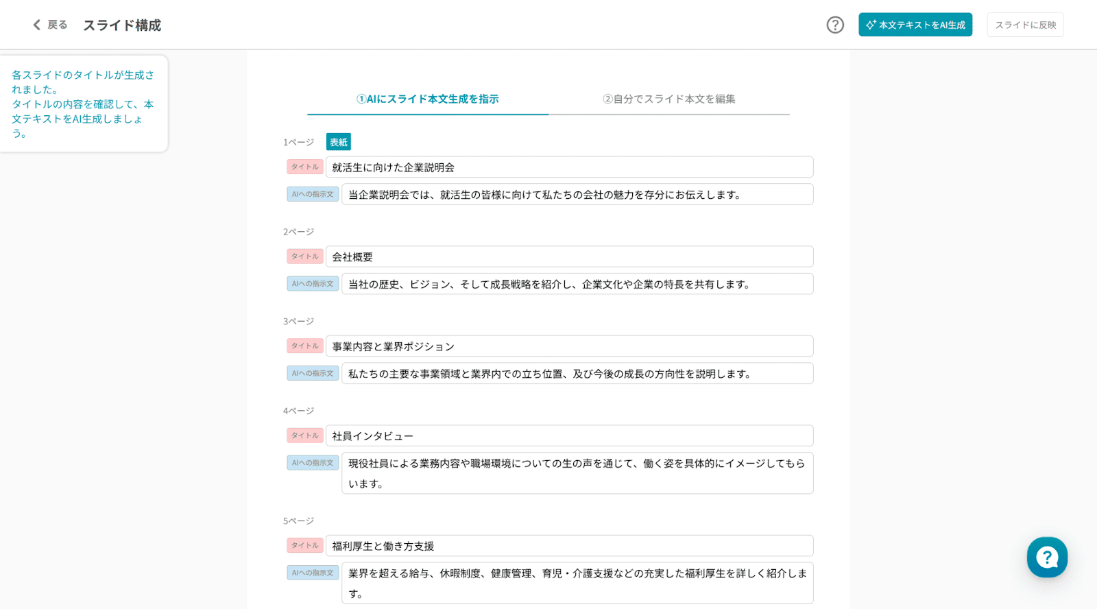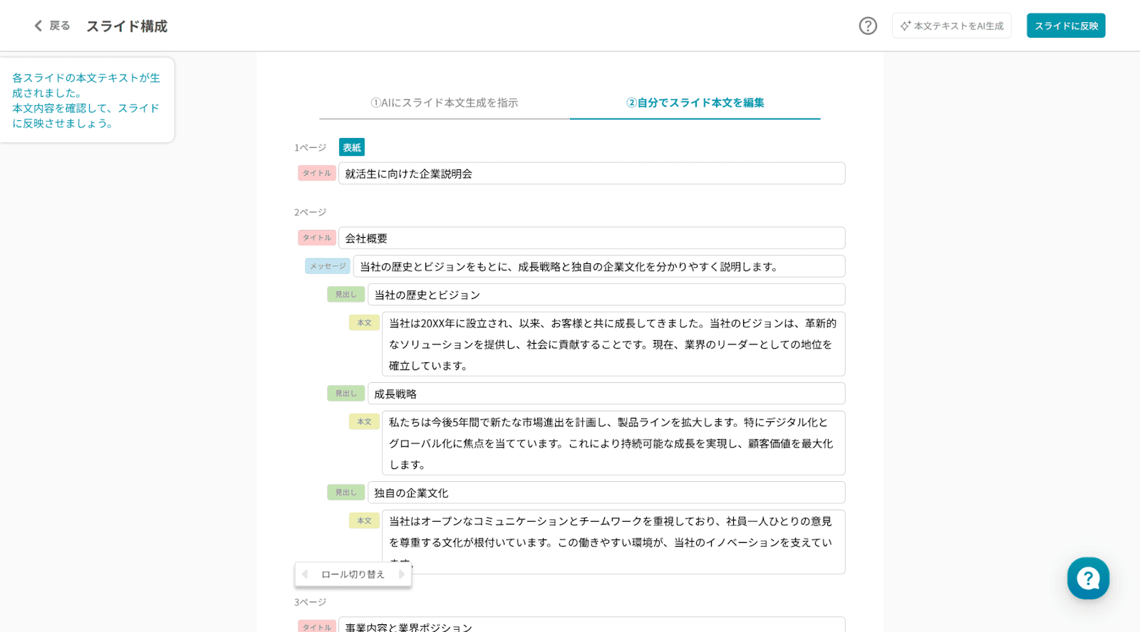 1,2分で骨組みに沿った本文が作成されました。最後に画面右上の「スライドに反映」ボタンをクリックすると、実際にスライドが作成されます。