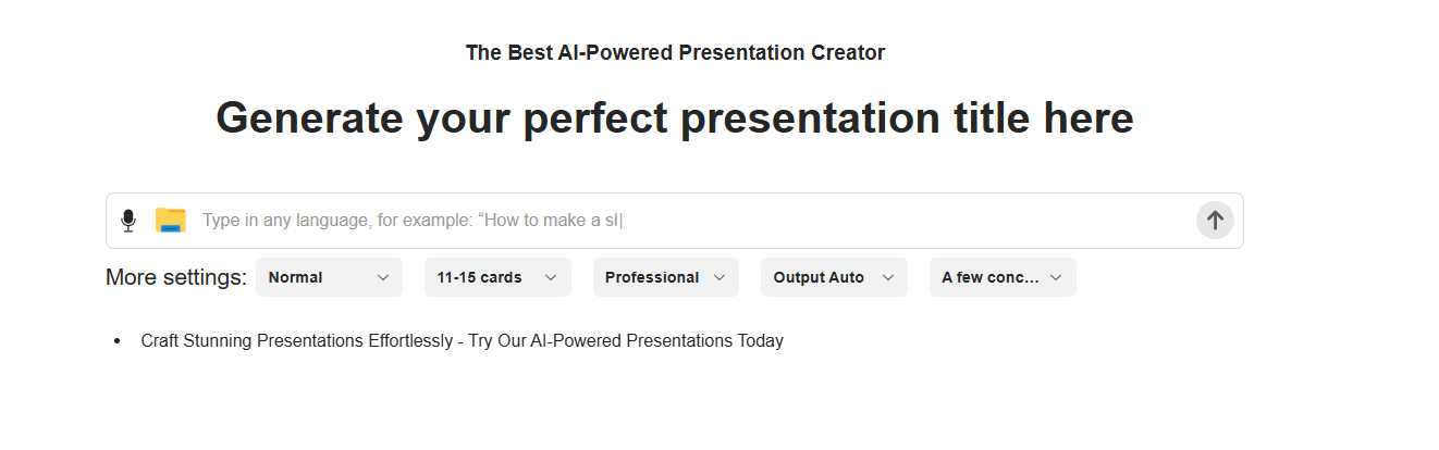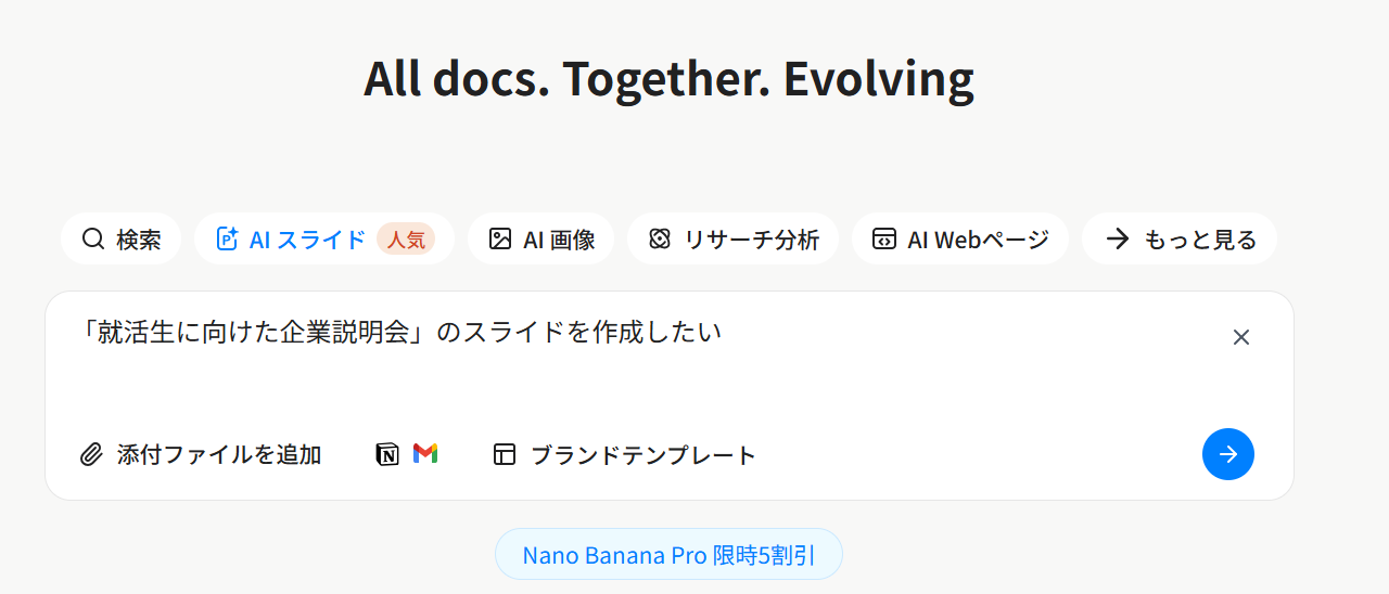 スライド生成AIとは、作成したい資料のテーマや要点をテキストで入力するだけで、AIが適切な文章、レイアウト、デザインを自動的に提案・生成してくれるツールです。従来のテンプレートを選ぶだけのツールとは異なり、内容そのものもAIが生成してくれるため、資料作成にかかる時間と労力を劇的に削減できます。