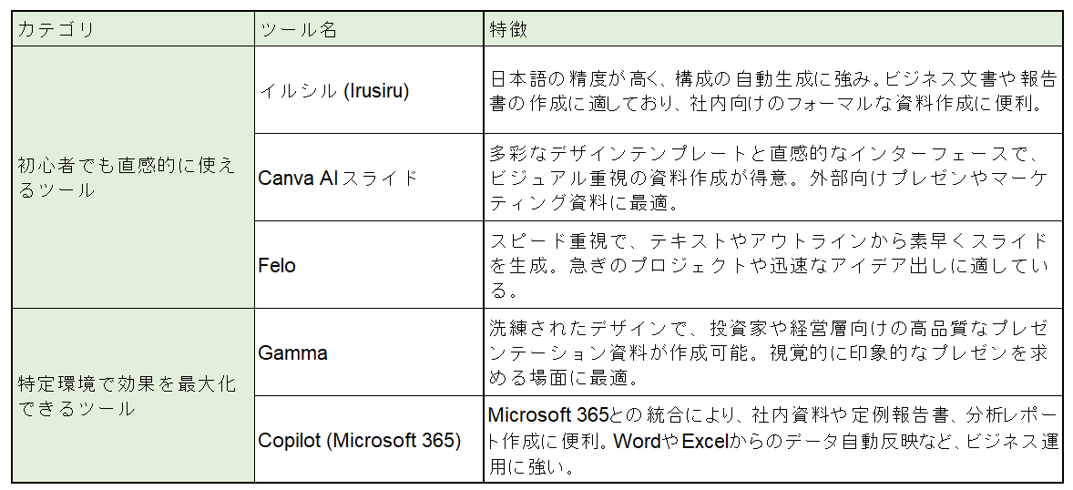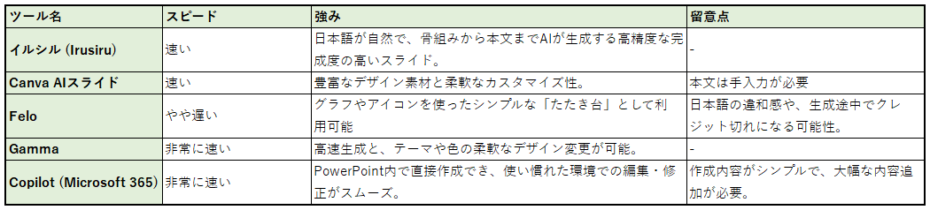 上記のポイントを踏まえて今回は5つのスライド生成ツールを紹介させていただきます。詳しくは後ほど記載させていただきますが、それぞれのツールで以下のような特徴があります。