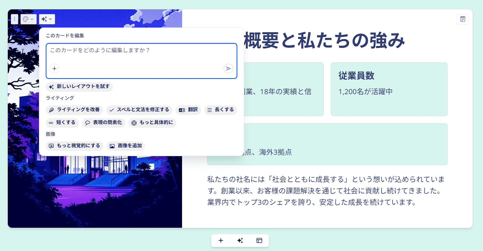 特に、日本企業のツールであるためか、日本語に不自然な点が全くなく、スムーズにスライド作成ができました。これなら、スライド作成の経験が少ない社員でも、立派なたたき台を短時間で作成できると思います。
