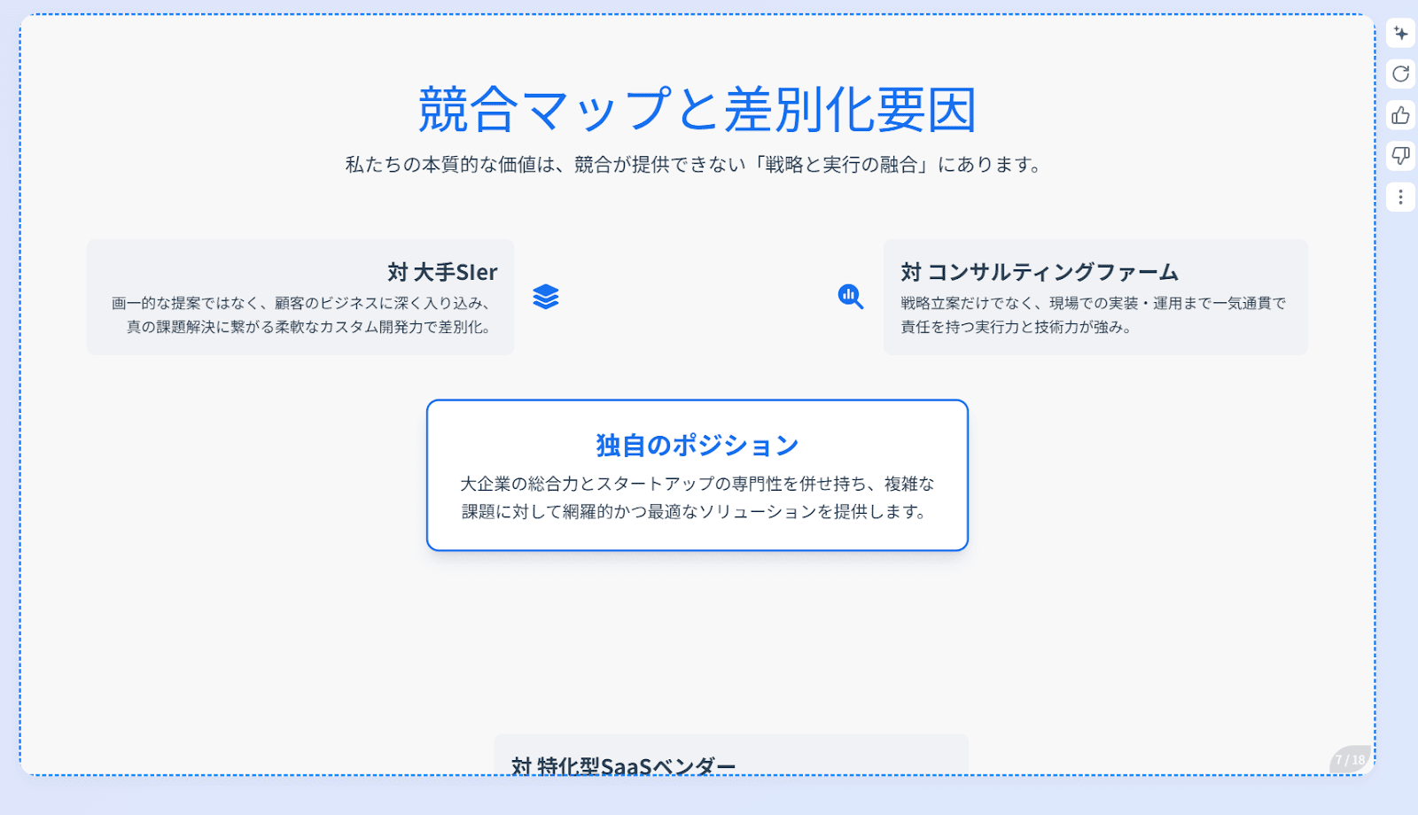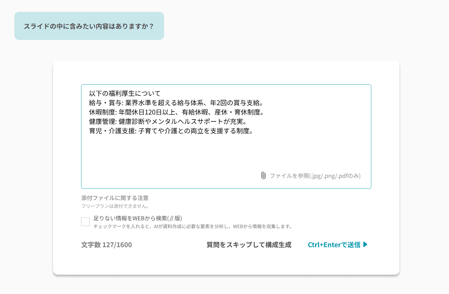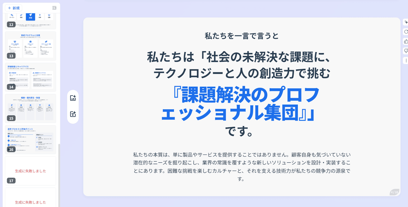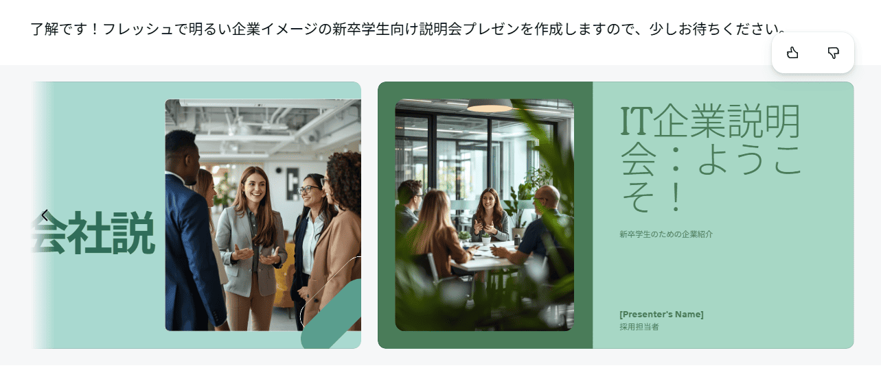 不自然な日本語やデザインの違和感がなく、「何から手を付けていいか分からない」という資料作成の最初の壁を、たたき台としてAIが構成案作りからサポートしてくれるのは非常に心強いです。