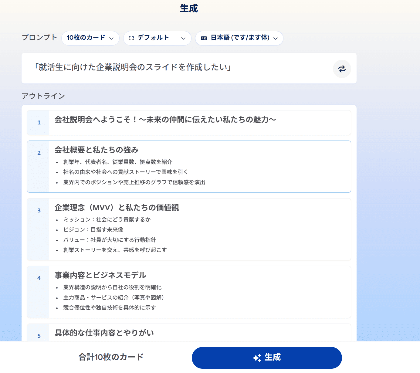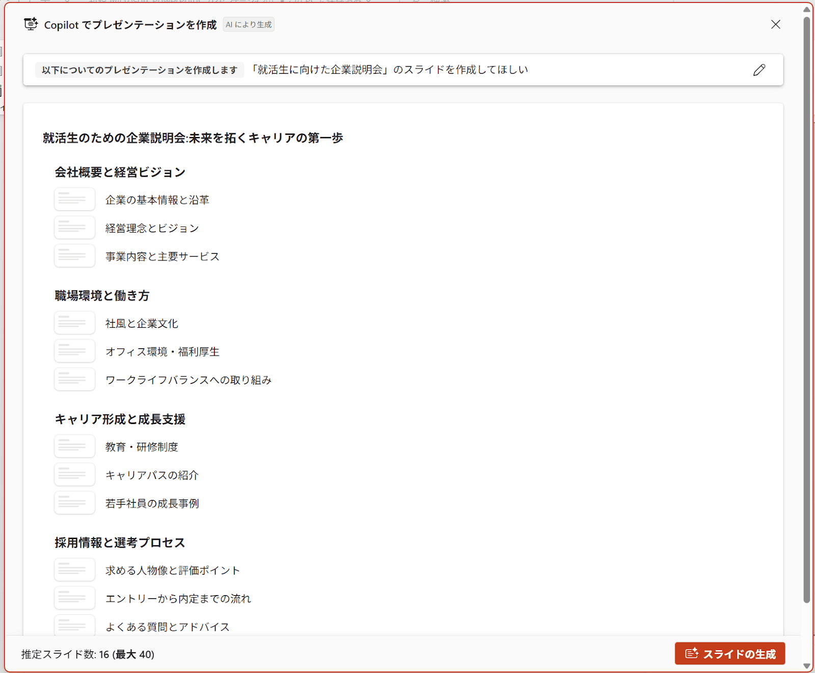 スライドの概要を伝えると、数十秒でアウトライン(骨組み)が表示されます。この内容を修正し、生成ボタンをクリックするとスライドが作成されます。