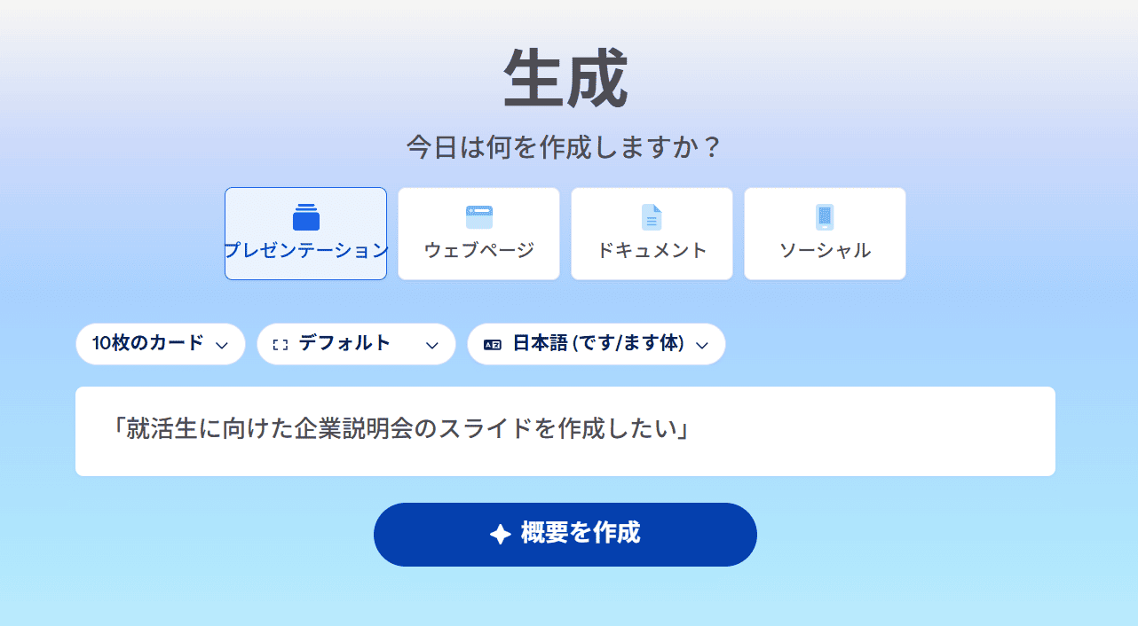 次に、Gammaの検証を行いました。AIに作成してほしい概要を入力する際、プレゼンのページ数や言語を選択するプルダウンが用意されていました。Feloではページ数で無料使用分が尽きてしまったため、この機能は非常に便利に感じました。