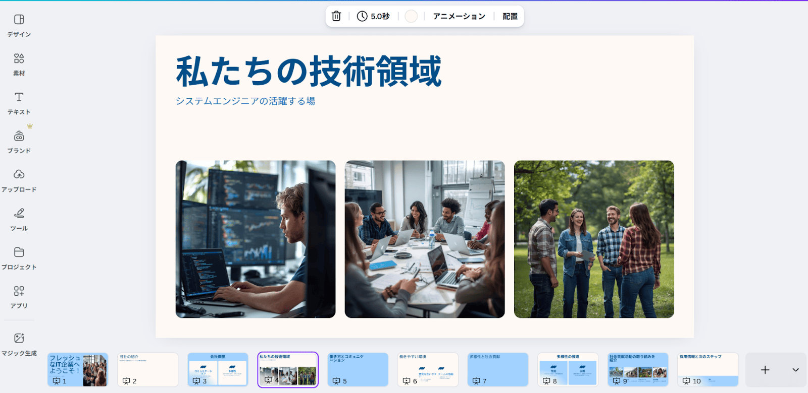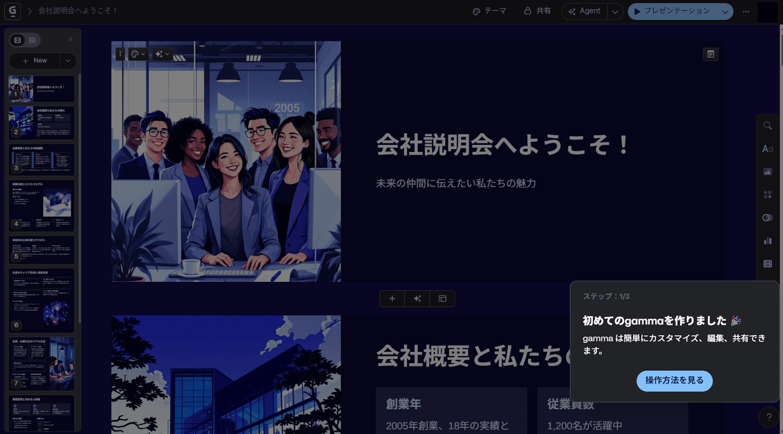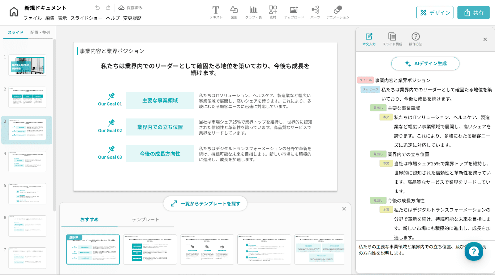 このように、骨組みと本文に基づいた完成度の高いスライドが作成されました。後は、内容を確認しながら自社の情報に書き換えるだけで、質の高いプレゼンテーションが簡単に行えそうです。