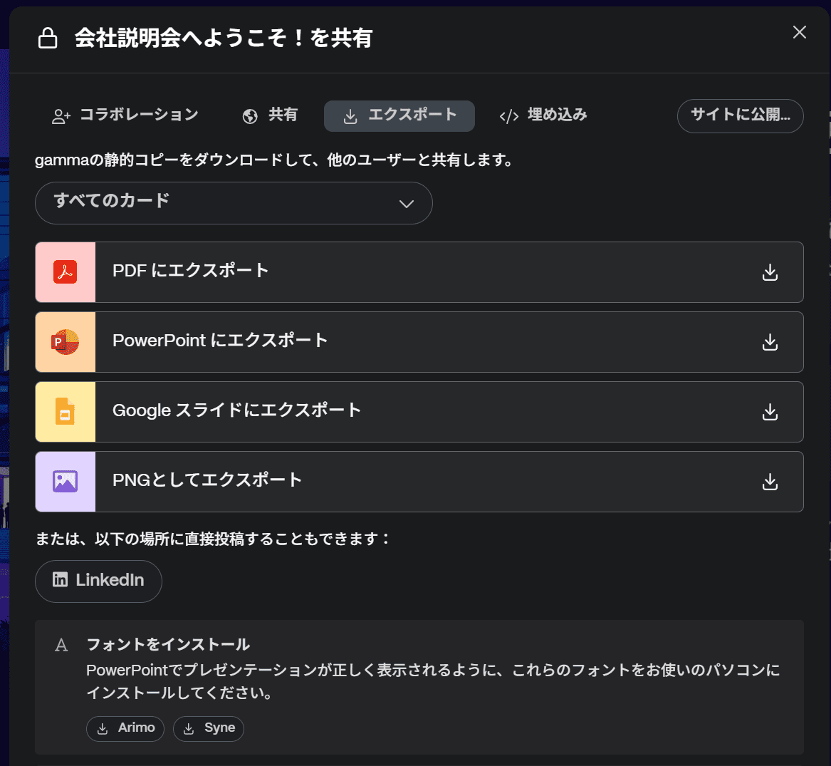 今回は生成が途中で止まってしまったためエクスポートは試せませんでしたが、パワーポイントやPDF形式での出力が可能とのことです。