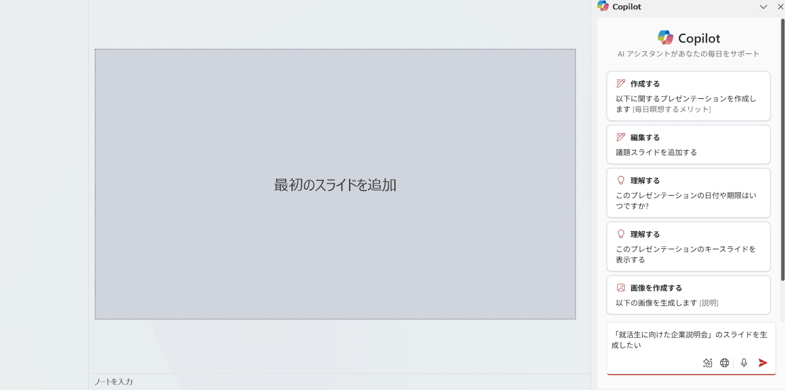 最後に、Copilotを使用したスライド生成を試しました。まずPowerPointのファイルを作成し、Copilotにスライド作成を依頼します。