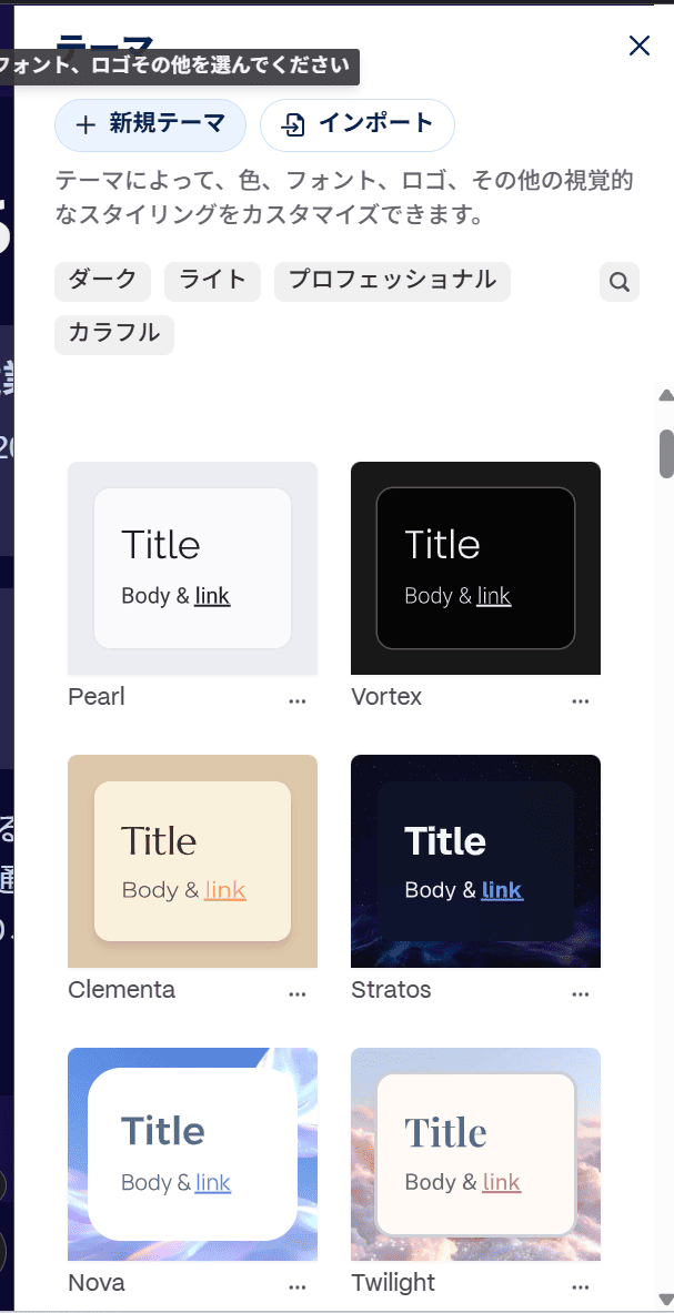 完成したスライドはシックな雰囲気ですが、もしイメージと異なっていても、テーマから色を簡単に変更できるため、柔軟に対応可能です。