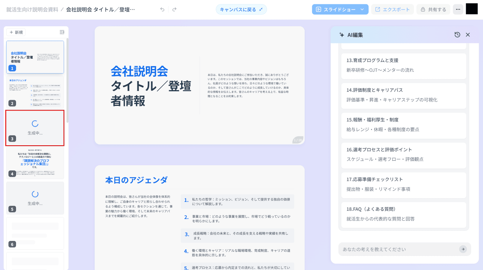 続いて、Feloを試用してみました。ログインすると無料クレジットが配布され、その範囲内で試用が可能です。「就活生に向けた企業説明会のスライドを作成したい」と伝えたところ、2〜3分でいくつかのプランが表示され、プランを選択することでスライドの生成が開始されました。
