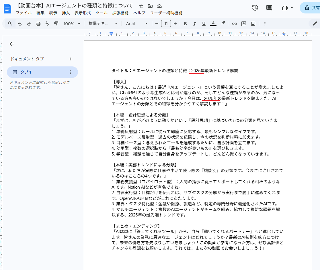 Googleドキュメントには、台本が作成されています。ただし、今回は最新と記載しつつも、2025年と1年前の表記でした。