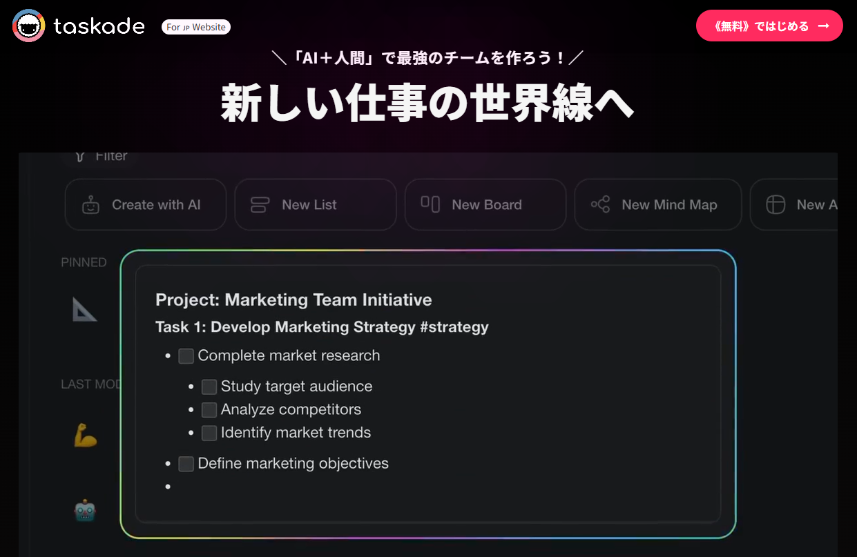 タスク管理やプロジェクト管理に特化した「汎用型」エージェントを作成できます。チーム内でのタスクの割り振りやスケジュール調整、アイデア出しなど、日々の業務進行をAIにサポートさせたいチームにおすすめです。ワークスペースとAIが一体化しており、企画から実行までの流れをスムーズに一元管理できます。