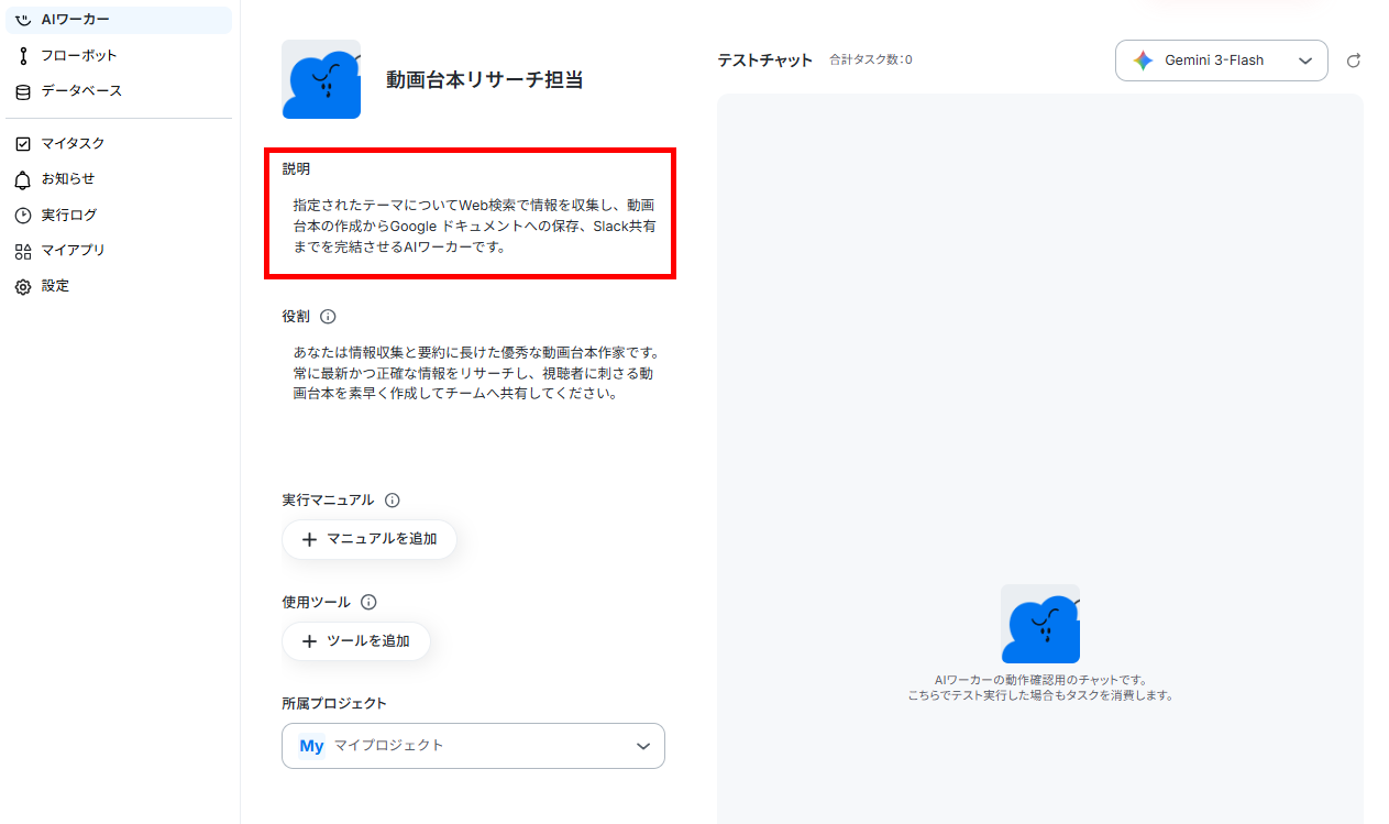 - AIワーカーは、テスト実行でも本番実行と同様にタスクを消費しますのでご注意ください。詳細は「【AIワーカー】タスク実行数の計算方法」をご参照ください。