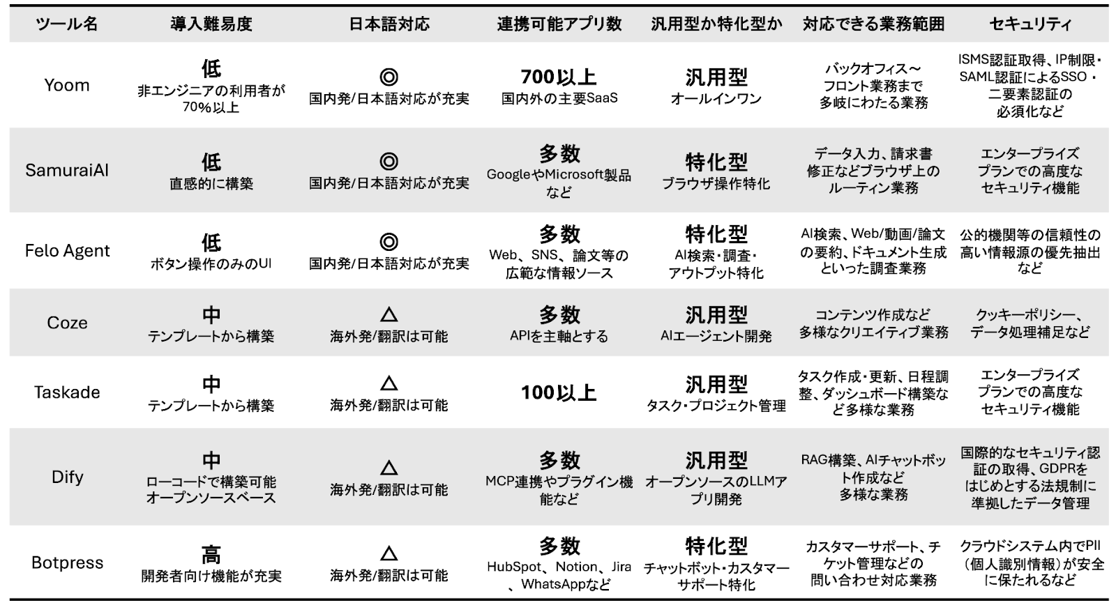 出典1:SamuraiAI/ 出典2:Felo(フェロー)- 無料のAI検索エンジン/ 出典3:Coze/出典4:Taskade(タスケイド)/出典5:Dify: 最先端のAgentic AI開発プラットフォーム/出典6:Botpress | 完全なAIエージェントプラットフォーム/その他出典:/Dify: プランと料金/Coze premium pricing plans/Taskade Pricing | AI App Builder Plans for Teams & Creators/Felo 個人ユーザー向けサブスクリプションモデル 大幅アップグレード | Felo Search Blog/Plans & pricing|botpress/SamuraiAI