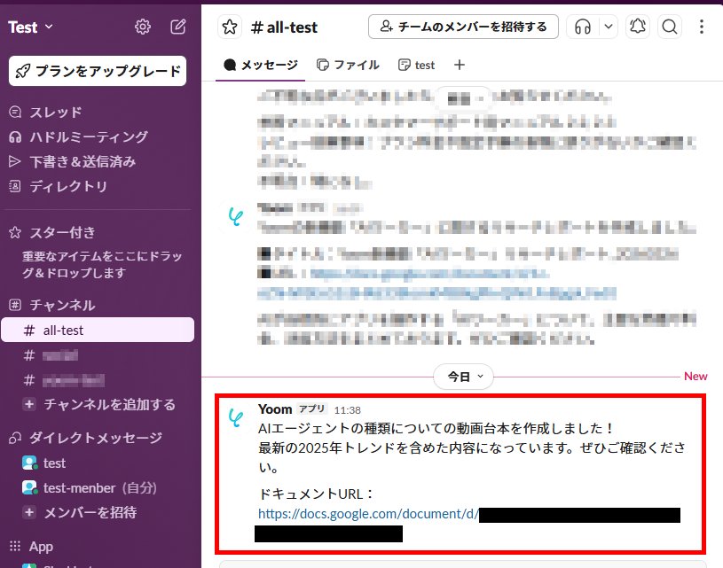 - Slackへの共有:保存したドキュメントのURLを、Slackを使用して指定のチャンネルへ投稿し、メンバーに共有します。