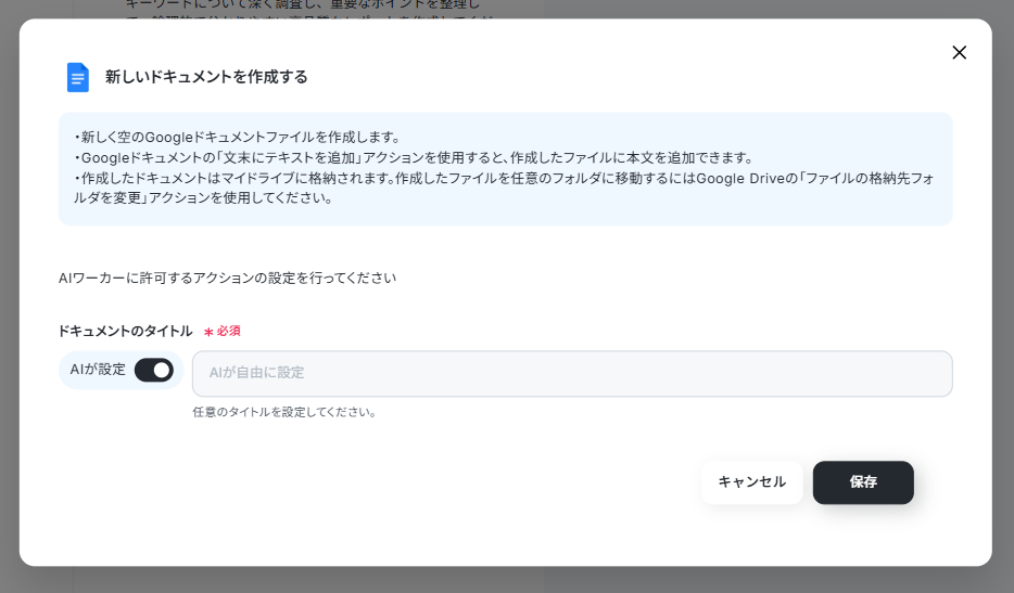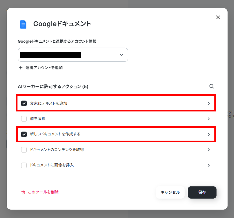 Googleドキュメントも同様に連携アカウントを確認します。AIワーカーに許可するアクションは、「文末にテキストを追加」と「新しいドキュメントを作成する」を選択しました。この2つを選択することで、リサーチを行うごとに、新しいドキュメントを作成して結果を記録することができます。