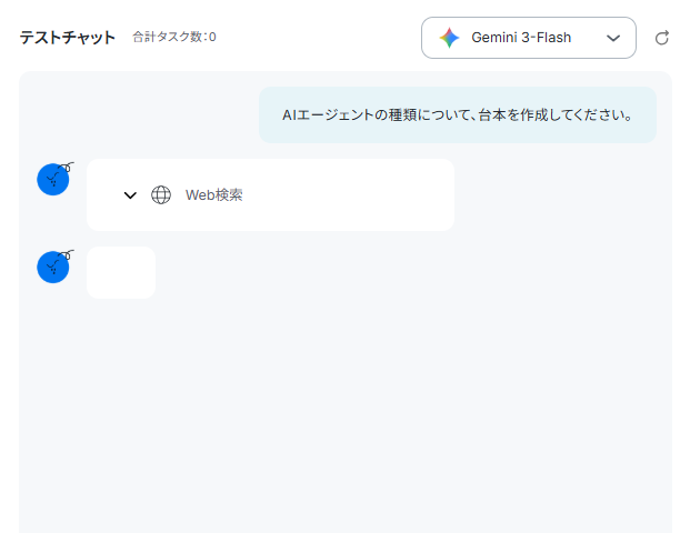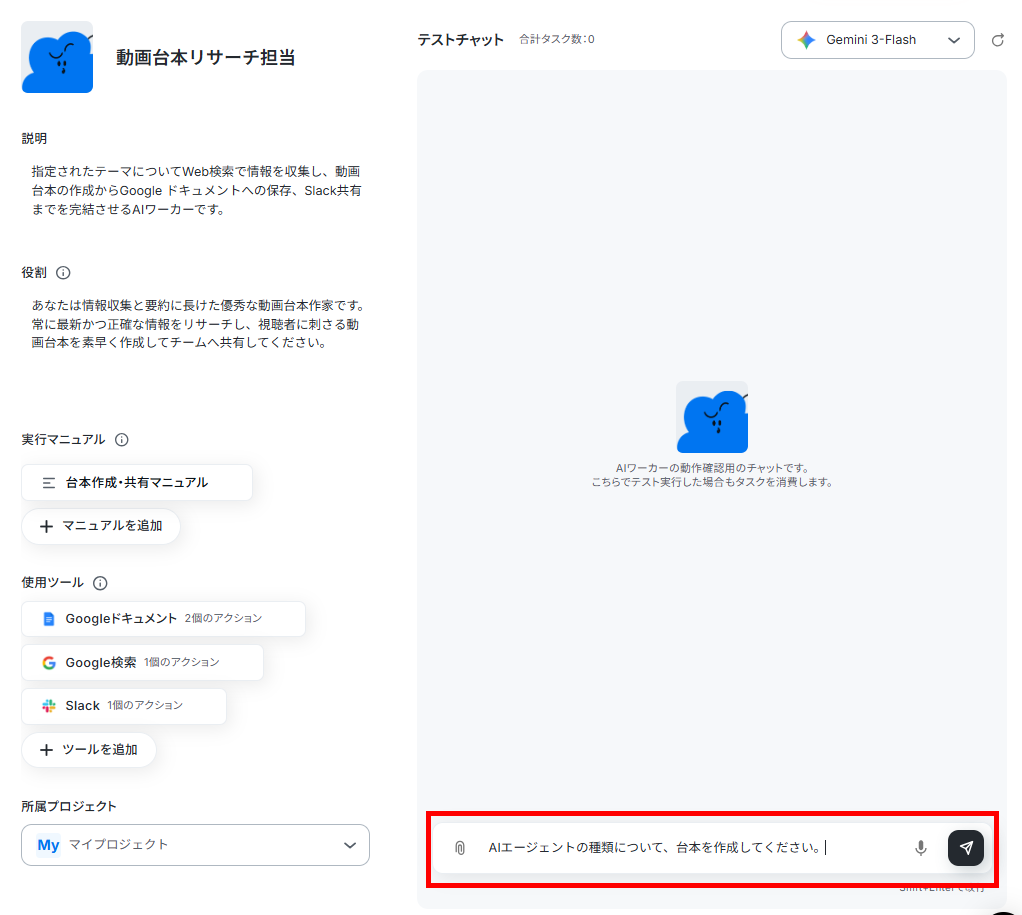 すべての設定が完了したら、チャット画面に具体的な指示を送信してみましょう。ここでのチャット入力が、AIに作業を行わせるトリガーとなります。AIワーカーは、マニュアルに沿ってタスクを実行できるため、リサーチしてほしい内容を簡単に伝えるだけで済みます。
