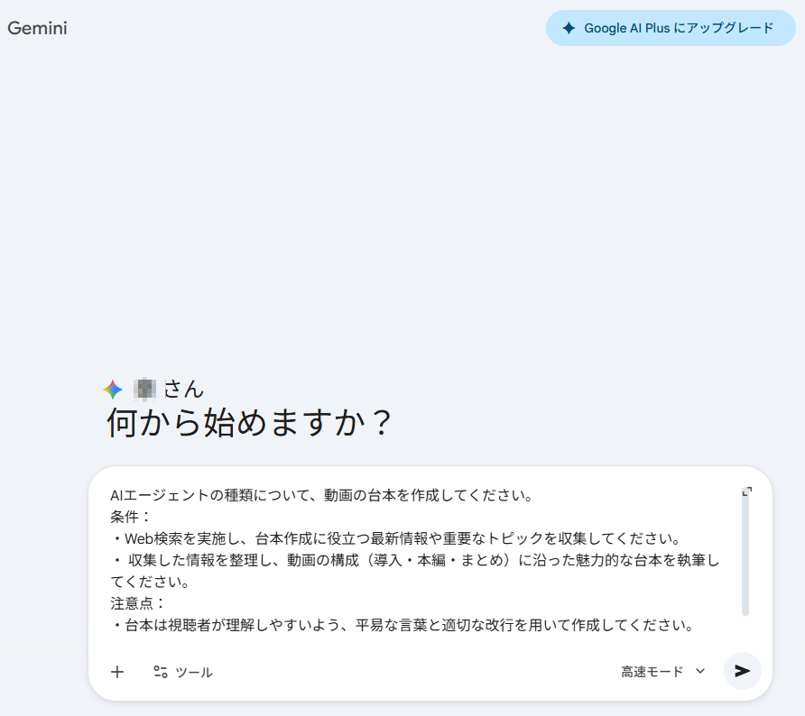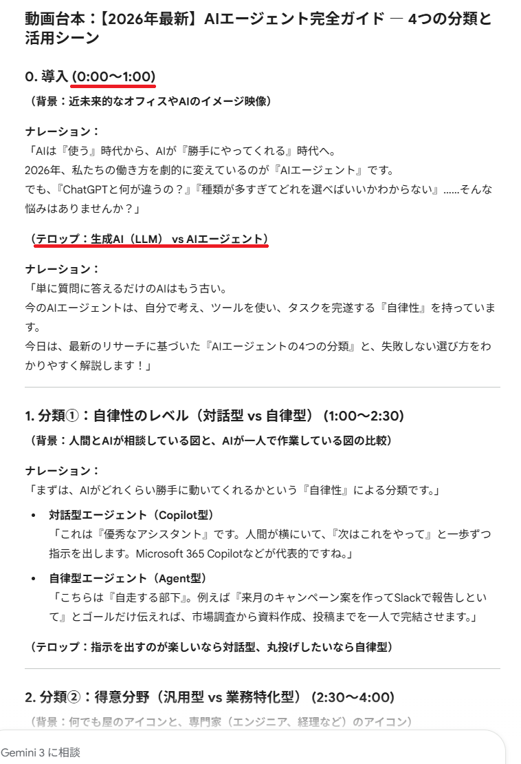 ここでは、先ほど作成した「動画台本リサーチ担当」と、Geminiなどの通常の生成AIを使って、使い勝手や業務効率にどのような違いがあるかを比較します。今回は、リサーチと台本作成をGeminiに依頼してみました。