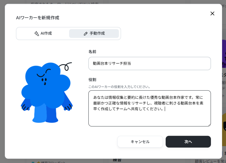 AIワーカーの概要を作成する際は、AIによる作成と手動による作成を選択できます。