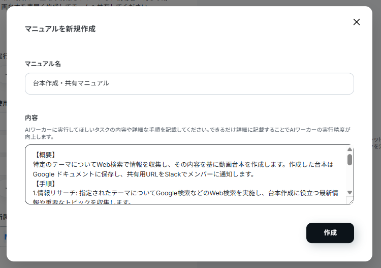 以上でAIワーカーの設定は完了です。マニュアルの作成については、以下のヘルプページも参考にしてみてください。