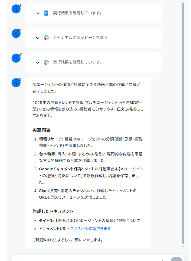 プロンプトを送信すると、連携したツールを使ってリサーチや台本の作成、そして共有が行われ、約40秒でタスクが完了しました。