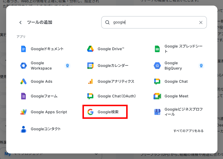 以下の画面が表示されるので、各ツールを検索して選択し、設定に進みます。