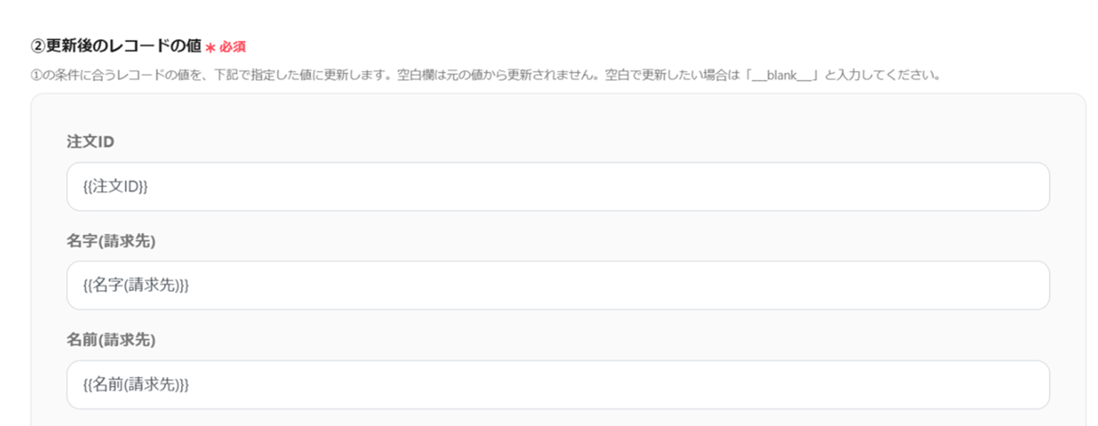 下へ進み、②更新後のレコードの値をアウトプットから選択します。