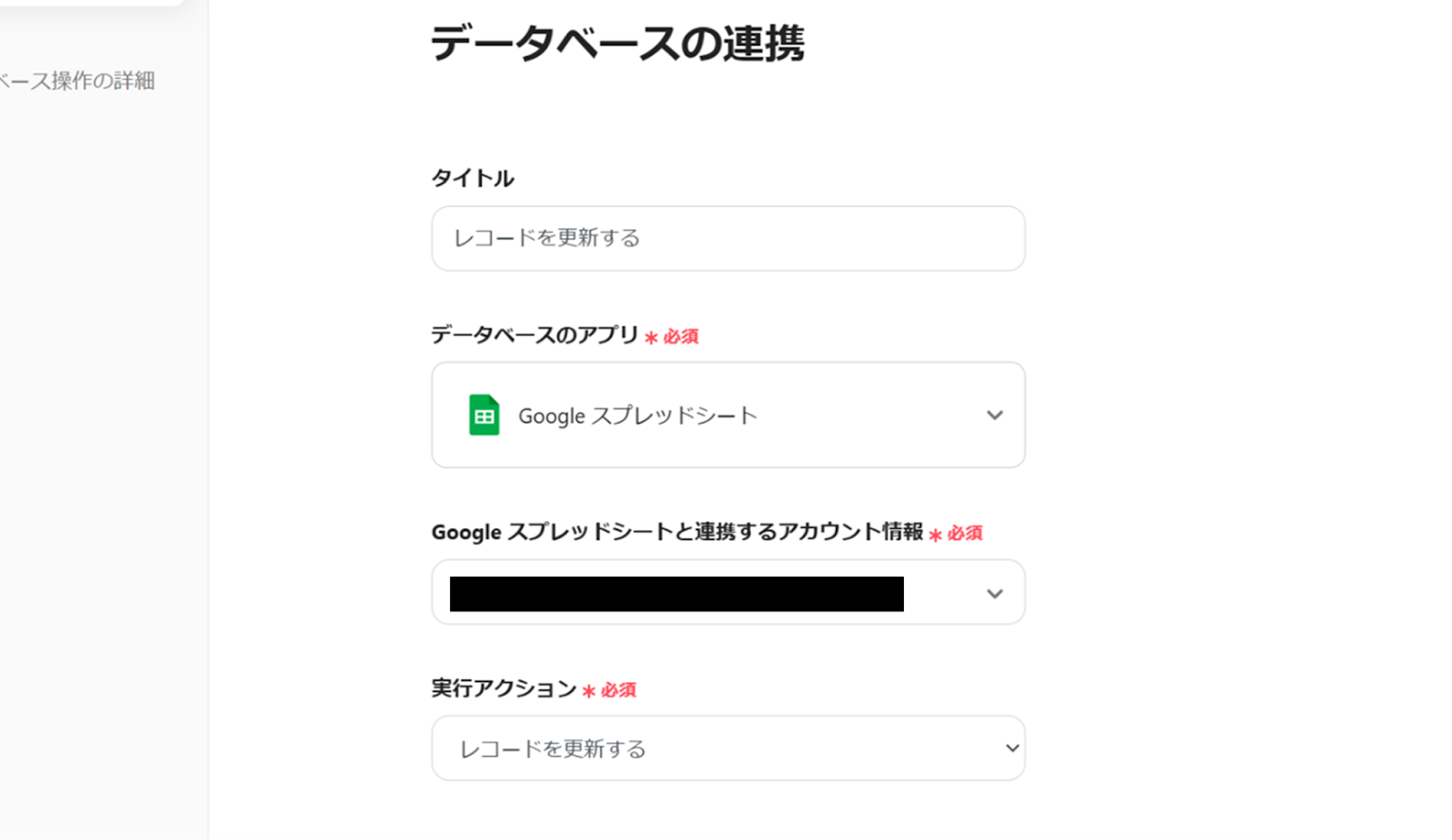 (2)「データベースの連携」画面から、Google スプレッドシートと連携するアカウント情報に誤りがないかを確認し、実行アクションは「レコードを更新する」のままにします。