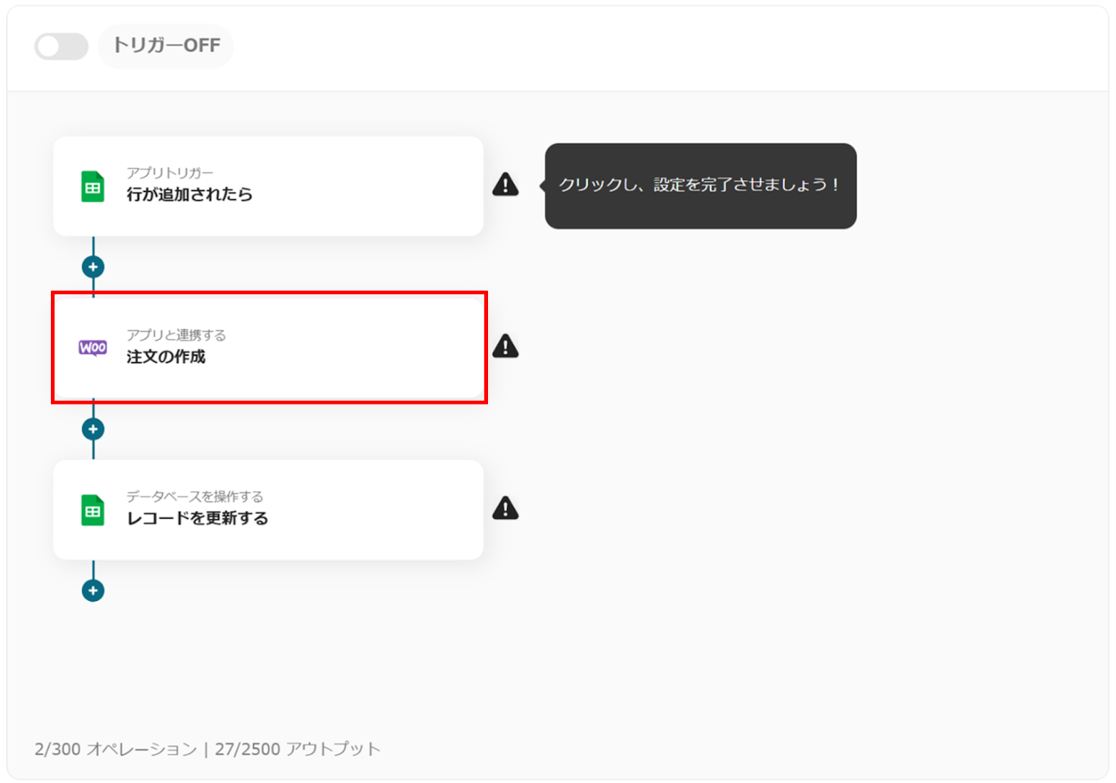 これで、「Google スプレッドシートで行が追加されたらWooCommerceに注文情報を追加する」フローボットの完成です。