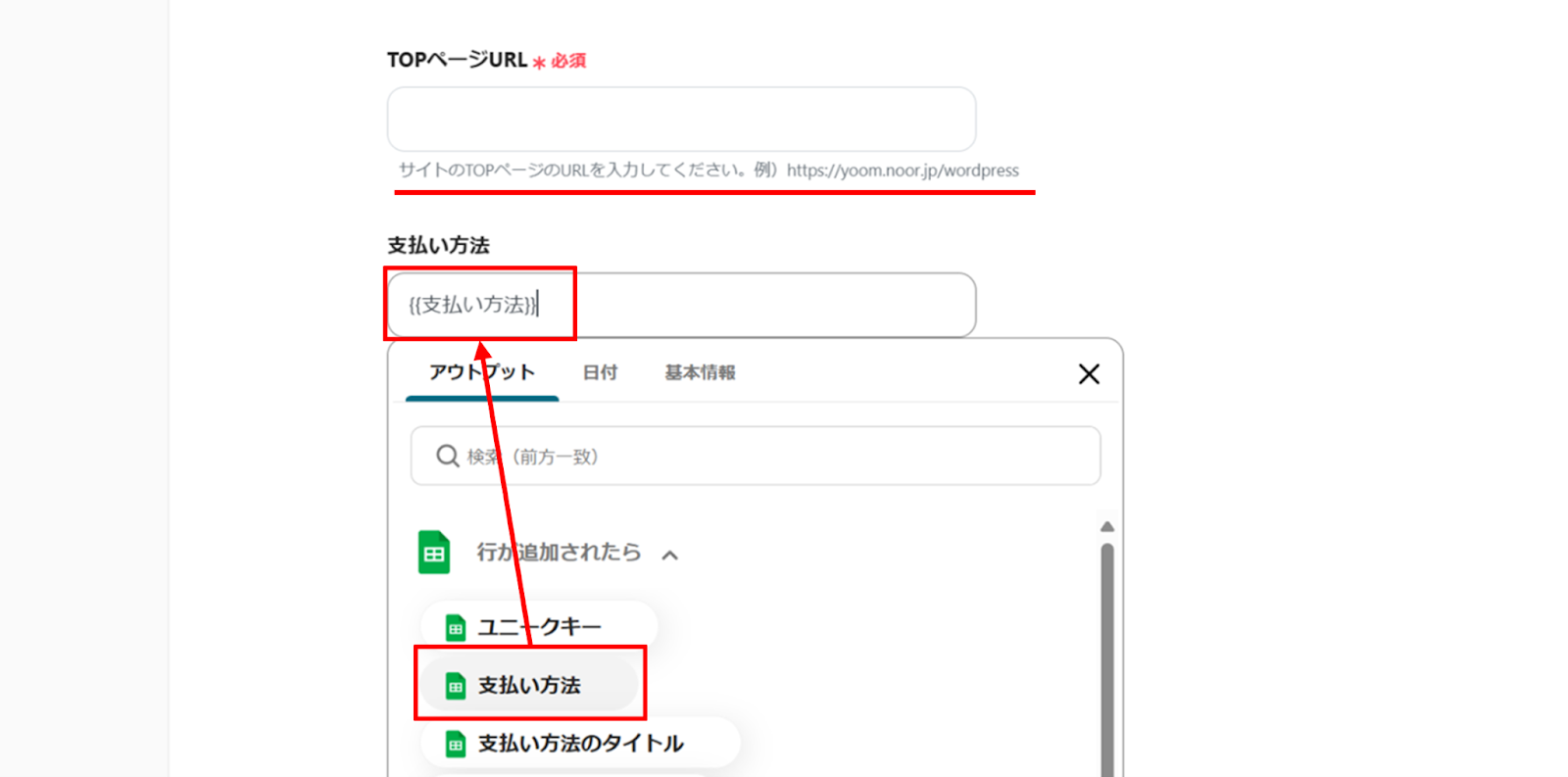 下の画像のようにアウトプットから選択することで、Google スプレッドシートの情報を引用することができます。