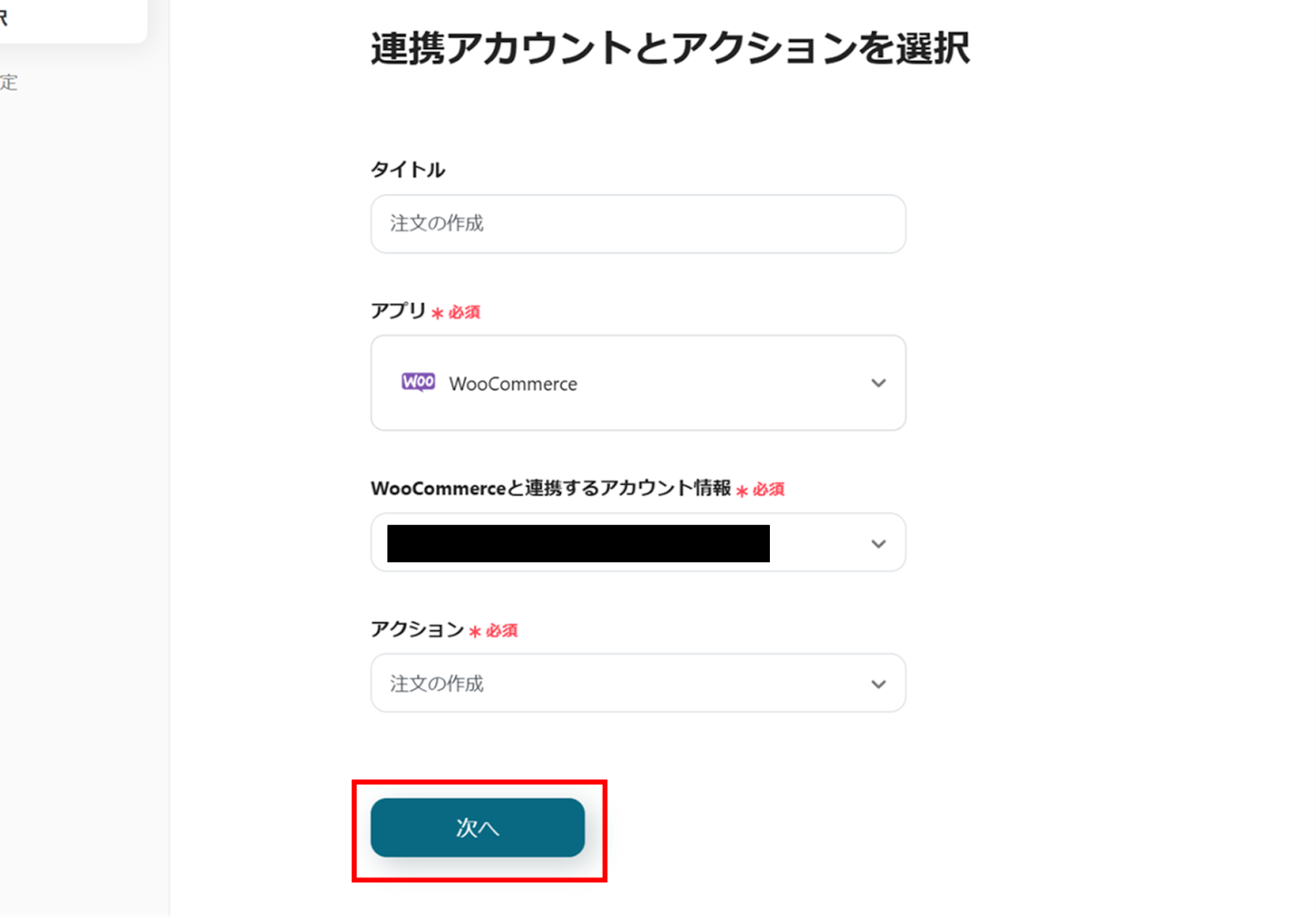 (2)WooCommerceの「連携アカウントとアクションを選択」画面から、WooCommerceと連携するアカウント情報に誤りがないかを確認し、アクションは「注文の作成」のままで「次へ」をクリックします。