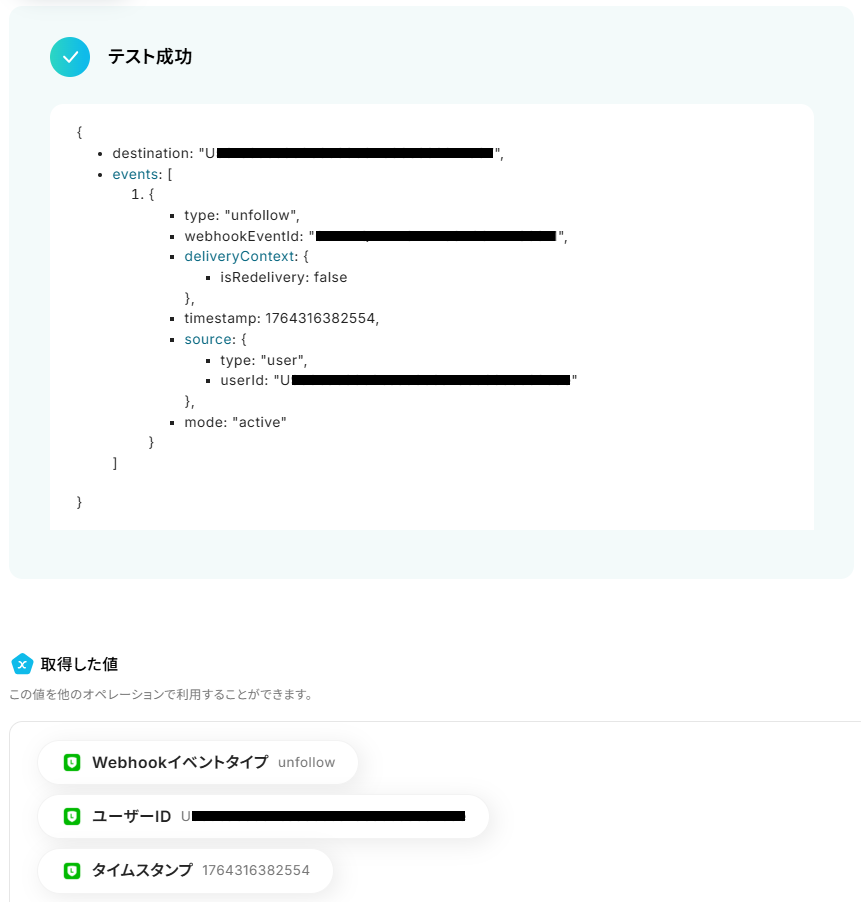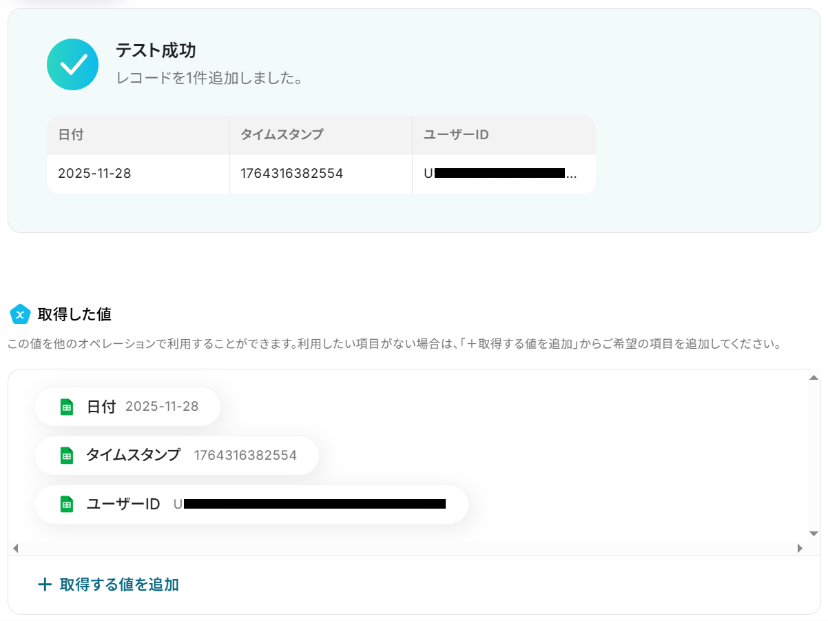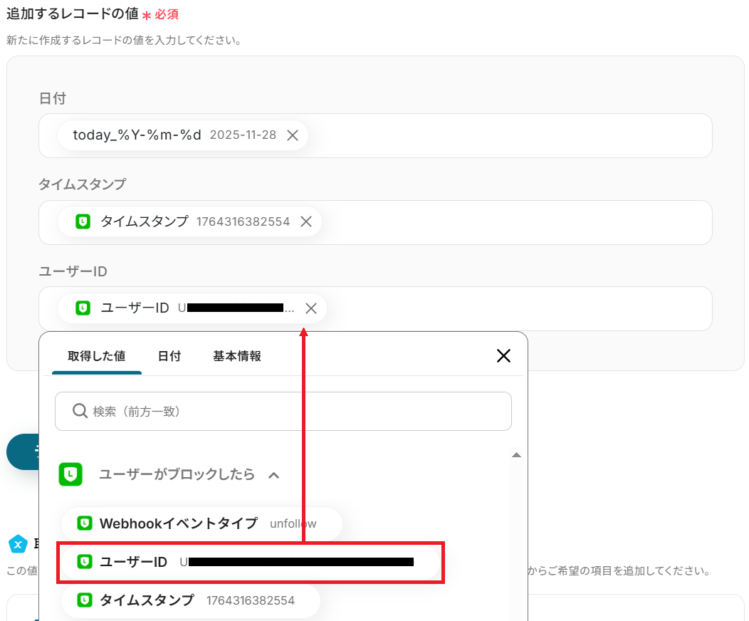 Google スプレッドシートに追加するレコード(行)は、任意の内容にカスタムが可能です。 例えば、LINE公式アカウントのトリガーから取得したユーザーIDやブロックされた日時などの情報を、指定した列に自動で記録するよう設定できます。 また、「ブロック済み」といったステータスを固定値として特定の列に追加する設定も行えます。 ■注意事項