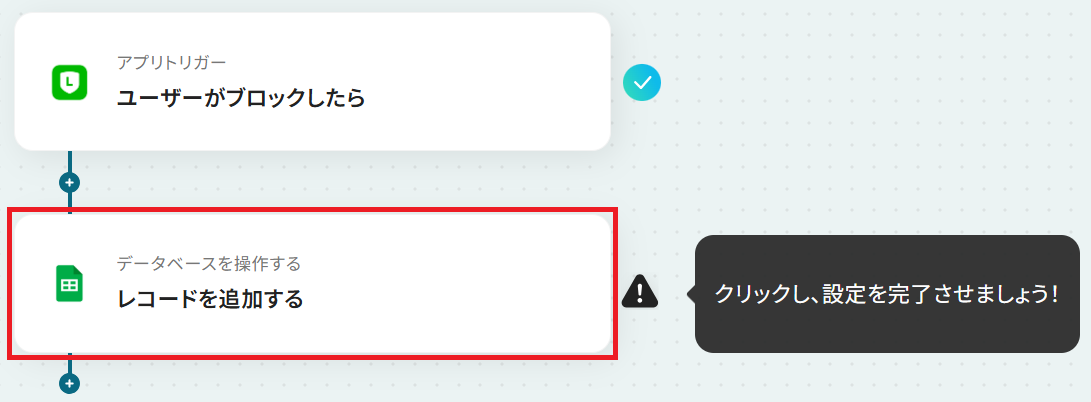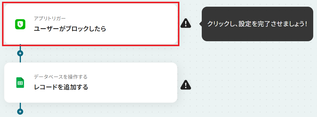 はじめに、LINE公式アカウントとGoogle スプレッドシートをYoomと連携します。 次に、トリガーでLINE公式アカウントを選択し、「ユーザーがブロックしたら」というアクションを設定します。 最後に、オペレーションでGoogle スプレッドシートの「レコードを追加する」アクションを設定し、ブロックしたユーザーの情報を記録するようにします。 ※「トリガー」:フロー起動のきっかけとなるアクション、「オペレーション」:トリガー起動後、フロー内で処理を行うアクション■このワークフローのカスタムポイント