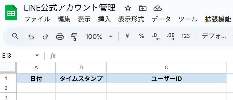 先ほど取得したユーザー情報をGoogle スプレッドシートに自動で追記する設定をします。 まず準備として、追記するためのシートをご用意ください。