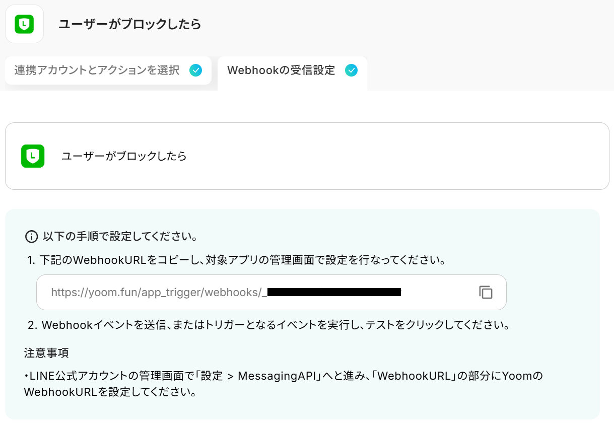 次に、先ほど友だち追加したアカウントでLINE公式アカウントをブロックしましょう。 ここまで完了したらYoomの設定画面に戻りテストしてください。