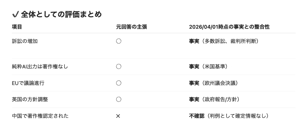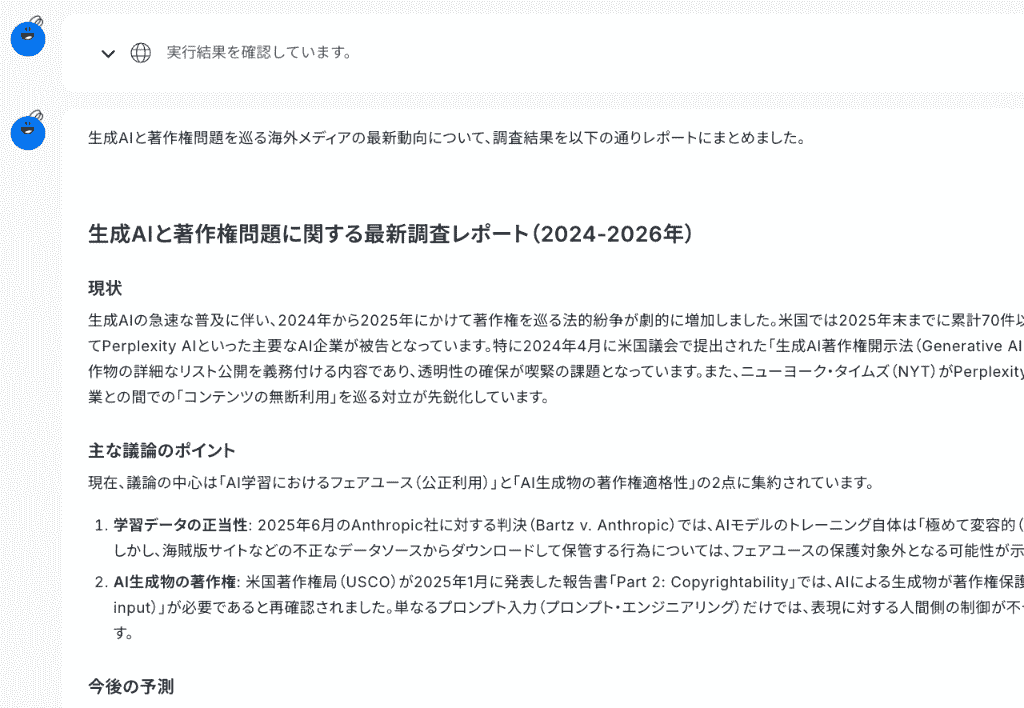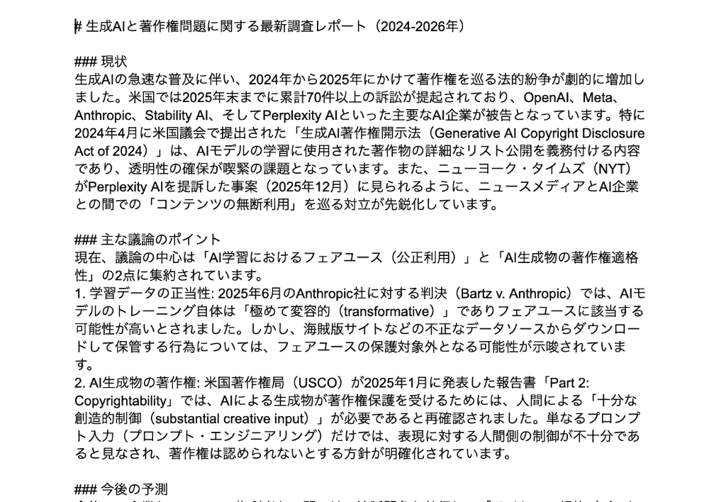 「生成AIの著作権問題の海外動向を教えて」と質問したところ、個人の一般的な見解やすでに日本国内でも報じられている有名な訴訟事例の羅列にとどまりがちでした。